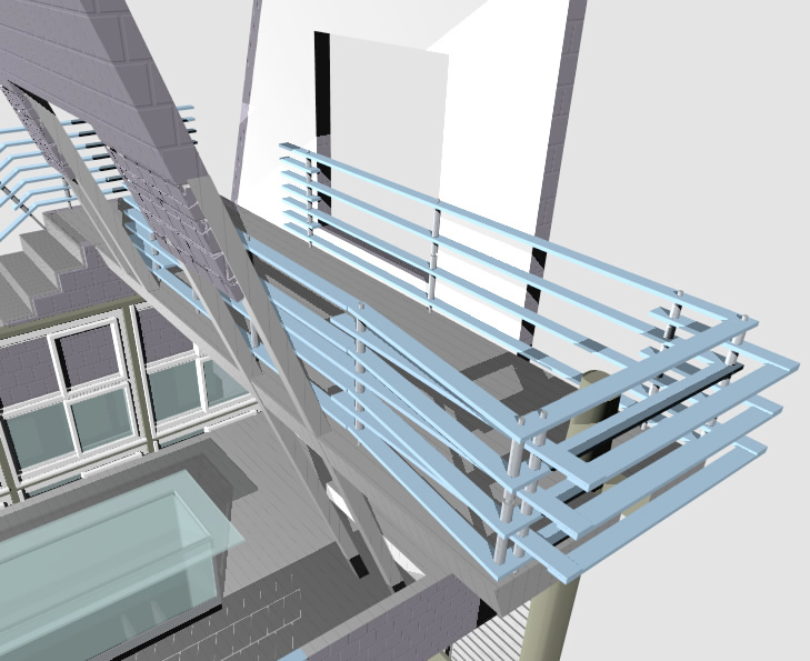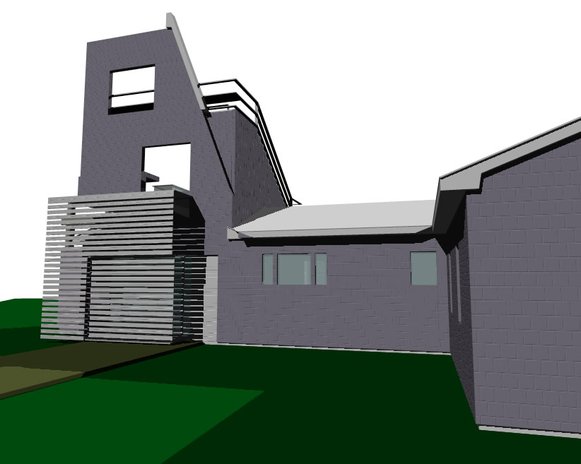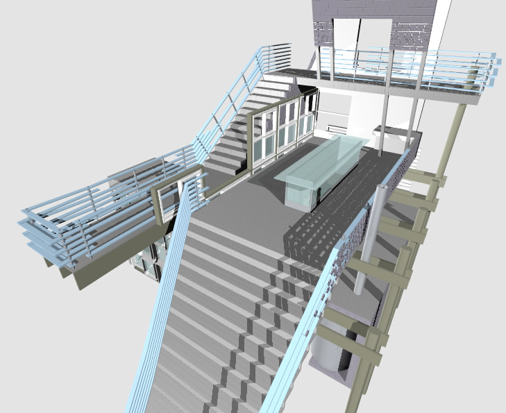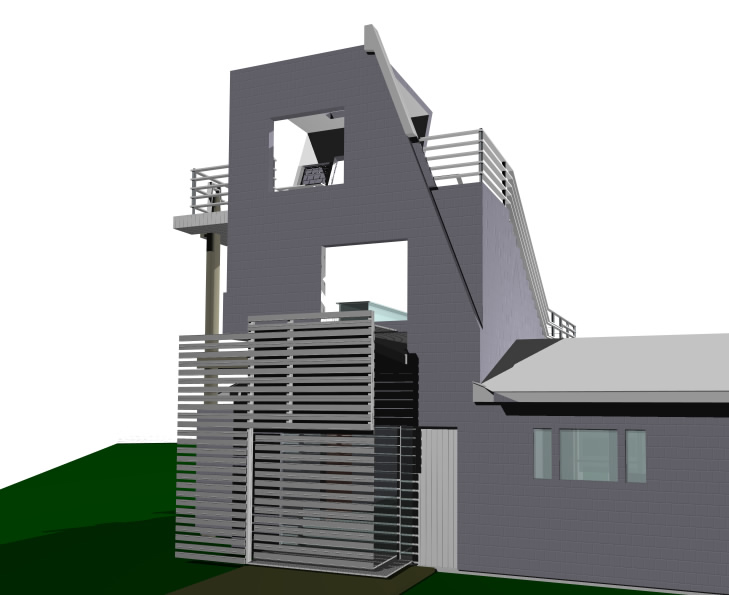 The dock of this waterfront house is drawn up into and onto the house as the new dining room, rooftop deck, and top deck. These inversions of water and land, land and air, lead to two other inversions: the front facade is turned up and over the top deck to be a new facade to these outdoor rooms, and the form of the inside dining room table raises up to form an outdoor dining table skylight set directly over the indoor table.