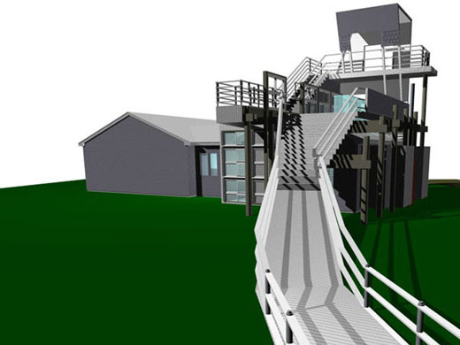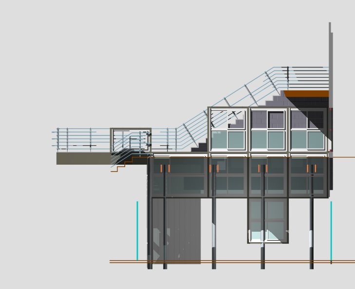 The dock of this waterfront house is drawn up into and onto the house as the new dining room, rooftop deck, and top deck — an inverse inhabition.