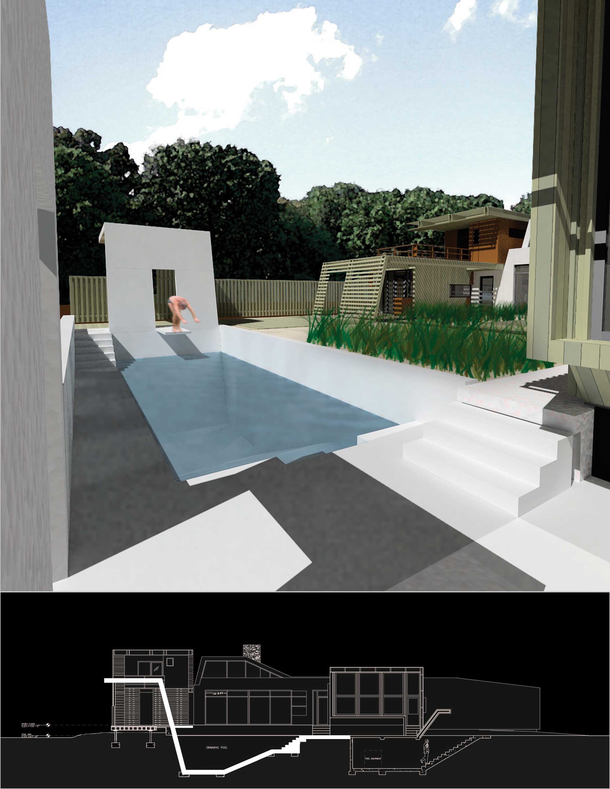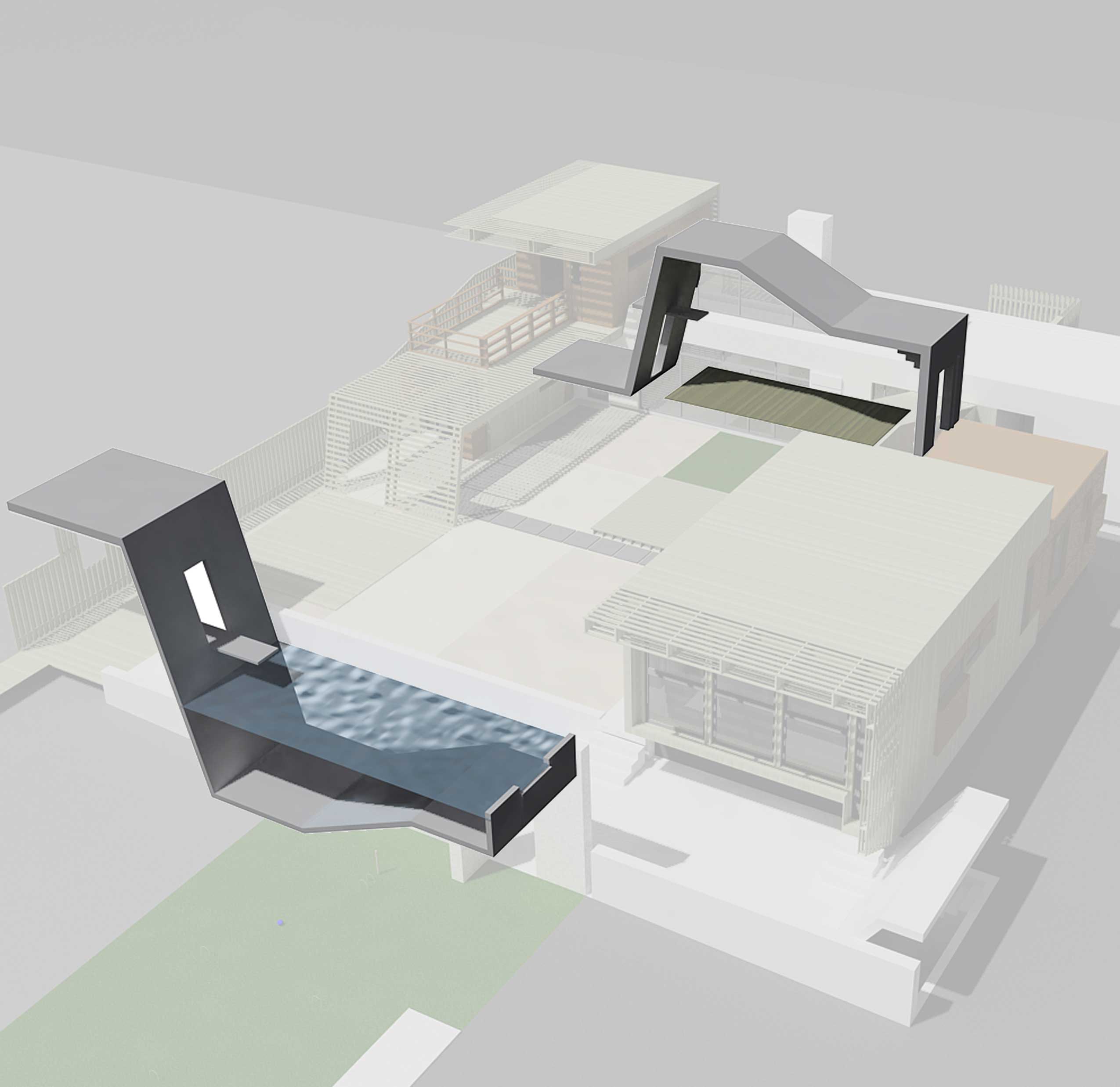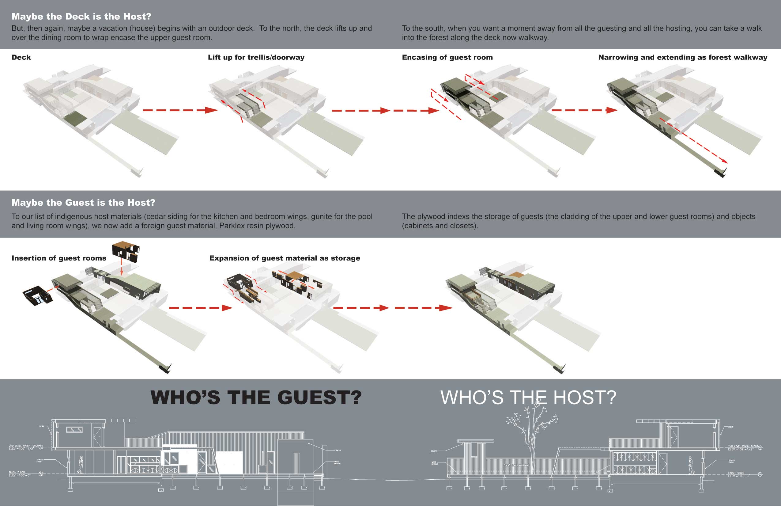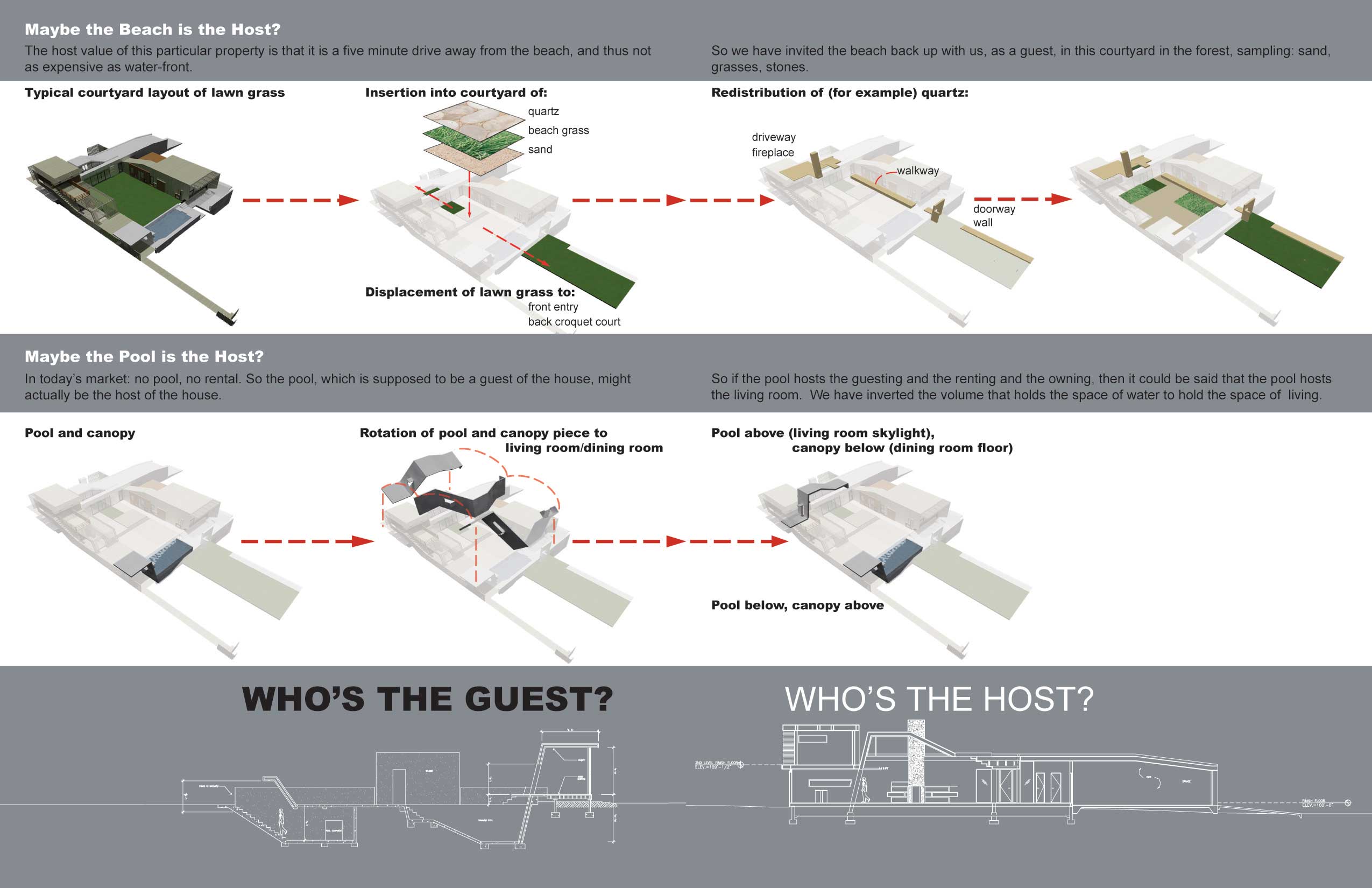 Like many houses in the Hamptons, this is neither a guest house nor a host house, as the owners can’t afford to own without renting in the high season. Sampling and scratching our materials from the local (host) residential context — gunite (from pools), wood siding and decking, grasses and sand and quartz stones from the nearby beach — we created social strands that weave over and under and into and out from each other, an unraveled and rewoven courtyard house, drawing forth varying symbiotic associations of guest and host.