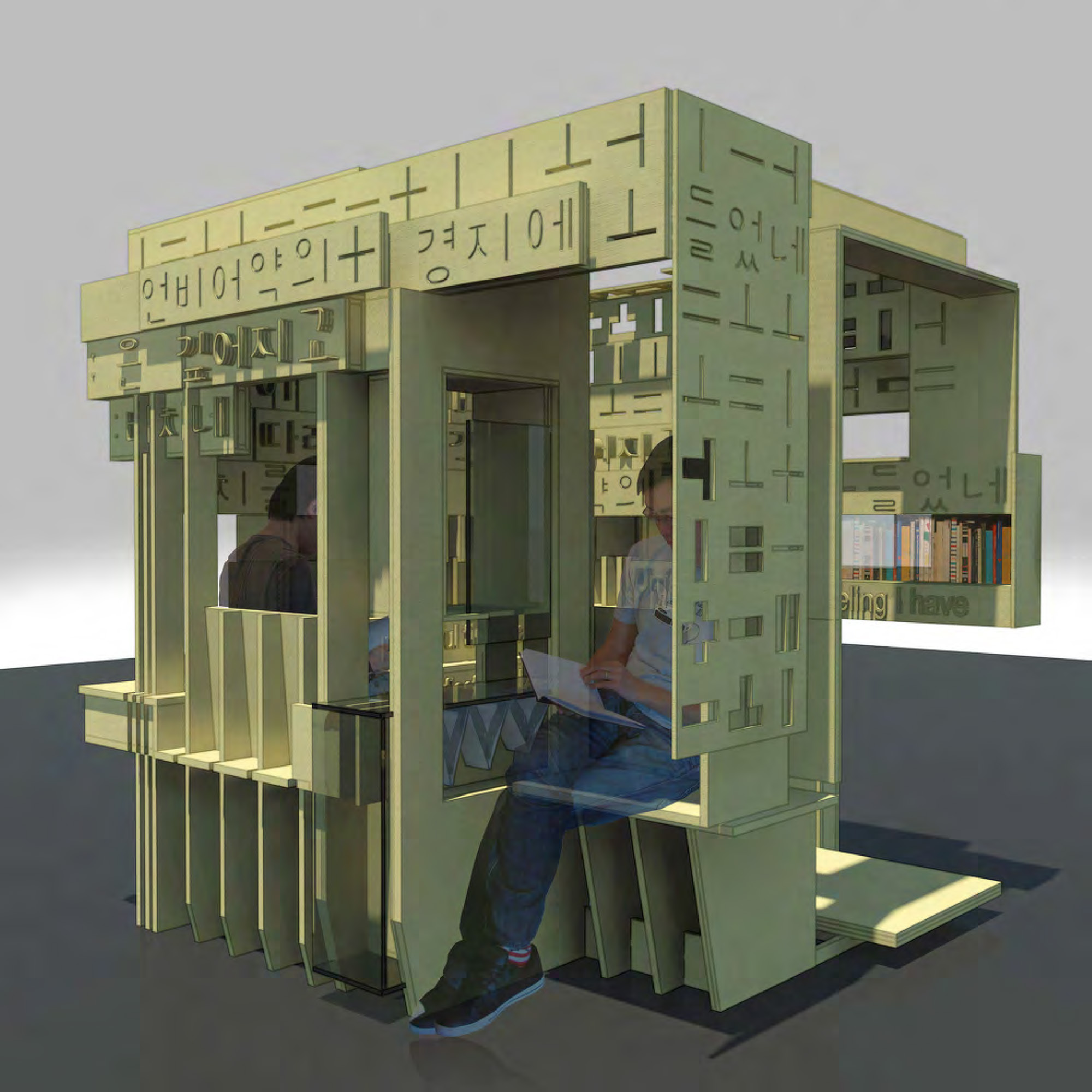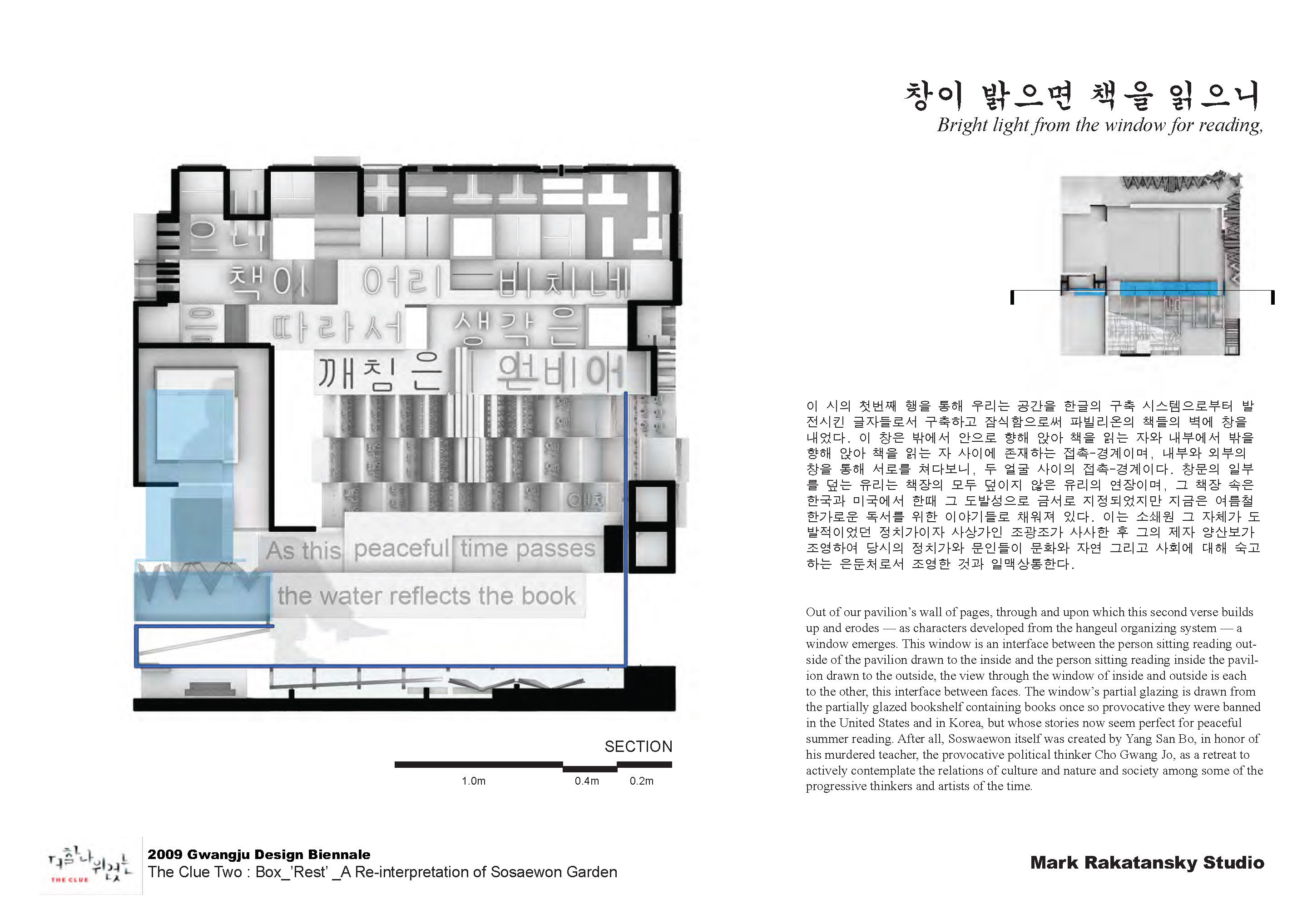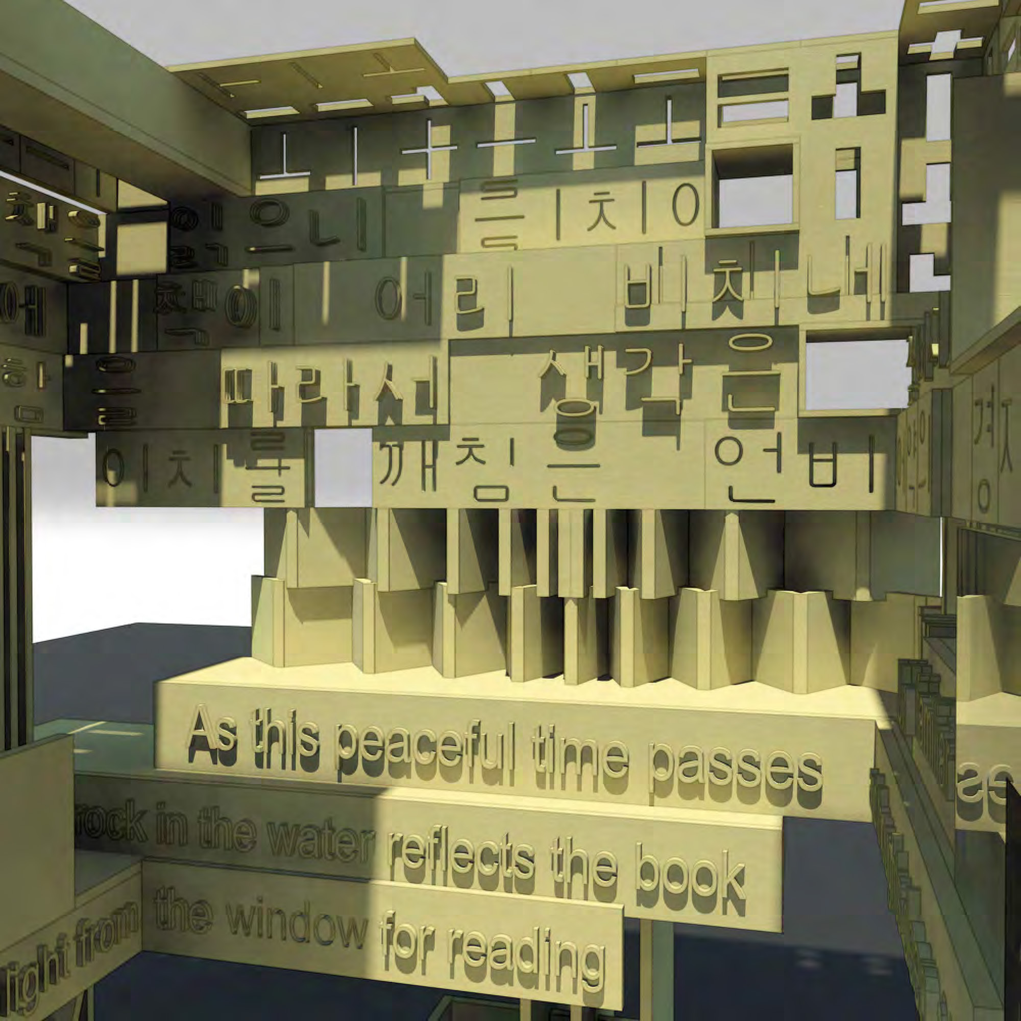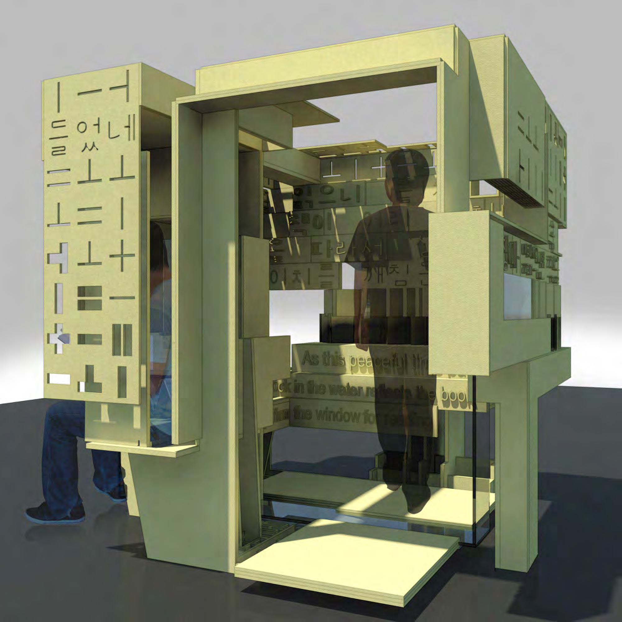 Out of our pavilion’s weave of walls of pages, the lines of the verse in Korean and English, and characters developed from the Korean language organizing system called hangeul — a window emerges. This window is an interface between the person sitting reading outside of the pavilion drawn to the inside and the person sitting reading inside the pavilion drawn to the outside, the view through the window of inside and outside is each to the other, this interface between faces. The window’s partial glazing is drawn from the partially glazed bookshelf containing books once so provocative they were banned in the United States and in Korea, but whose stories now seem perfect for peaceful summer reading. After all, Soswaewon itself was created by Yang San Bo, in honor of his murdered teacher, the provocative political thinker Cho Gwang Jo, as a retreat to actively contemplate the relations of culture and nature and society among some of the progressive thinkers and artists of the time.