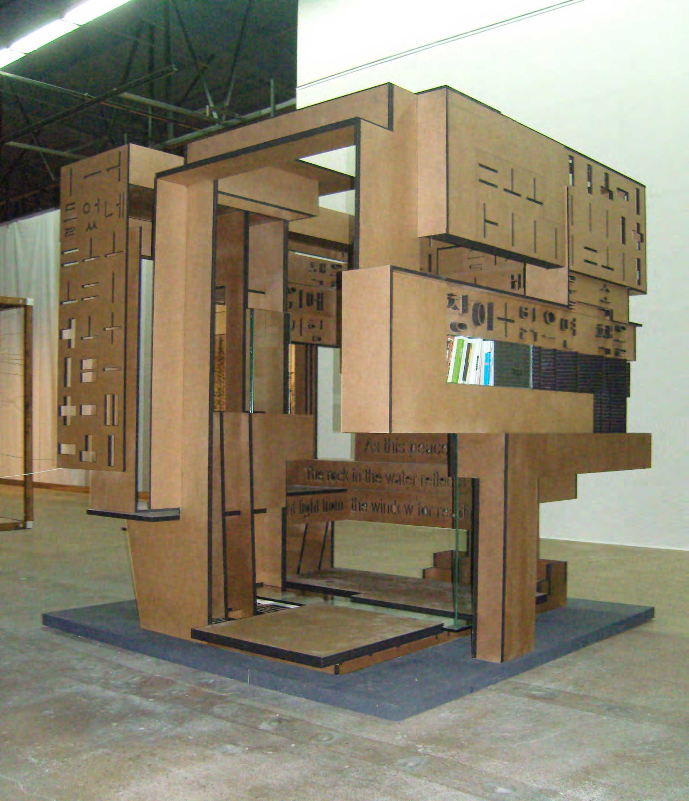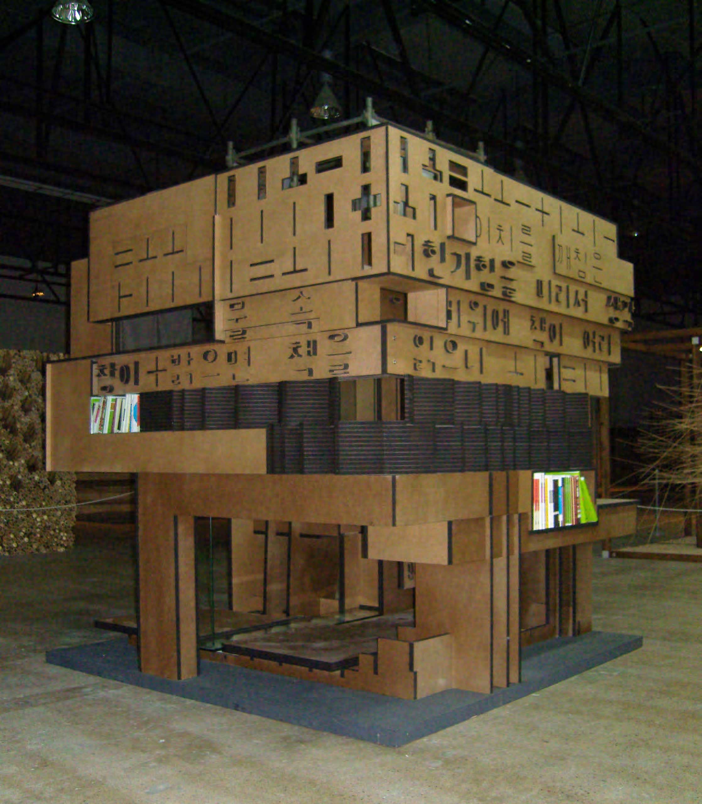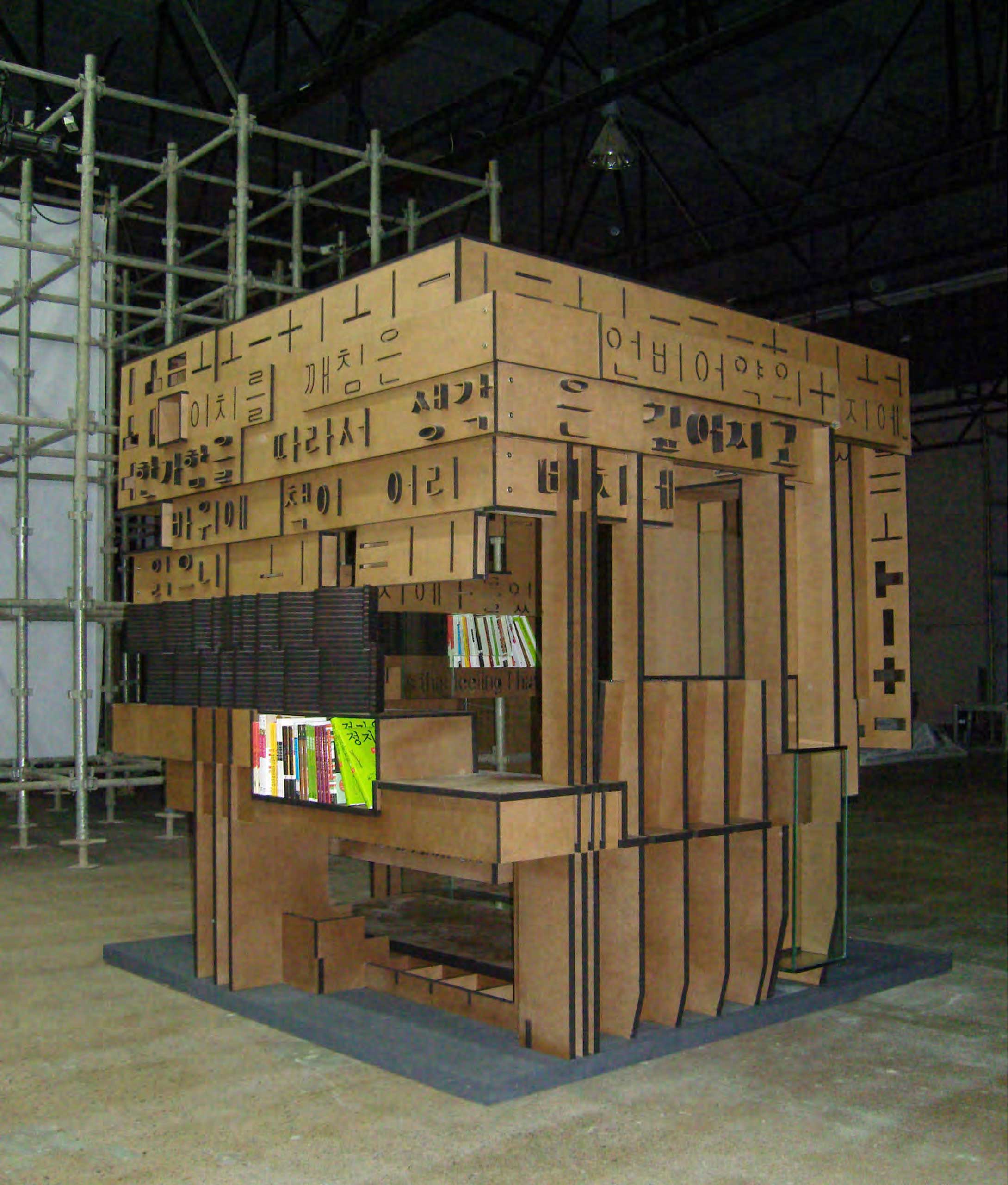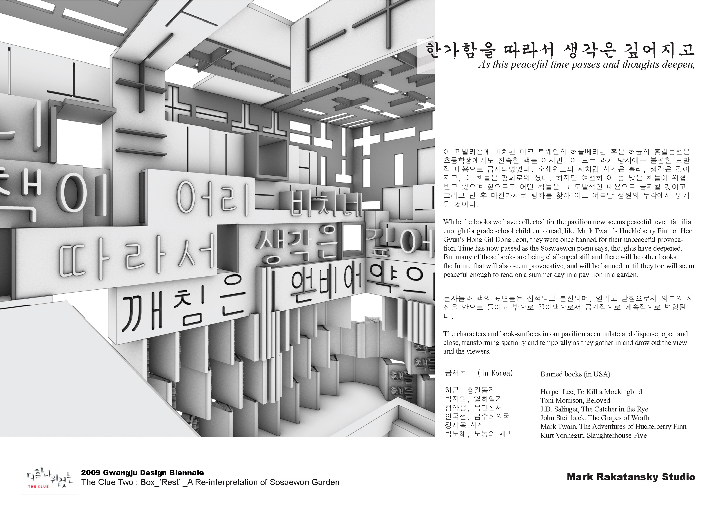 For the 2009 Korean Biennale, we were asked to produce a 2 meter pavilion which would be a contemplation of notions of rest within the context of a landmark Korean garden Soswaewon. As the garden was created in the 16th century by Yang San-bo to honor the political murder of his teacher Jo Gwang-jo, we created a Summer Reading Pavilion (for Banned Books). An 18th century poem written both within and about Soswaewon provided by the curator served as our starting point. Korean and English characters wrap a stanza of the poem around the 2 meter space, defining the boundary and enfolding two seats where visitors are invited to read one of the selected Korean and English books that have been banned at various times in the two countries.