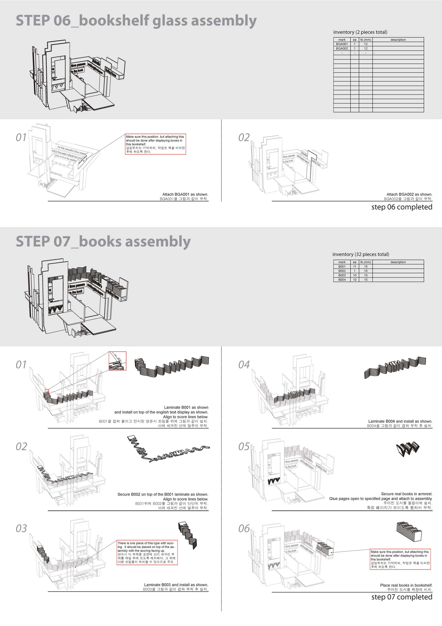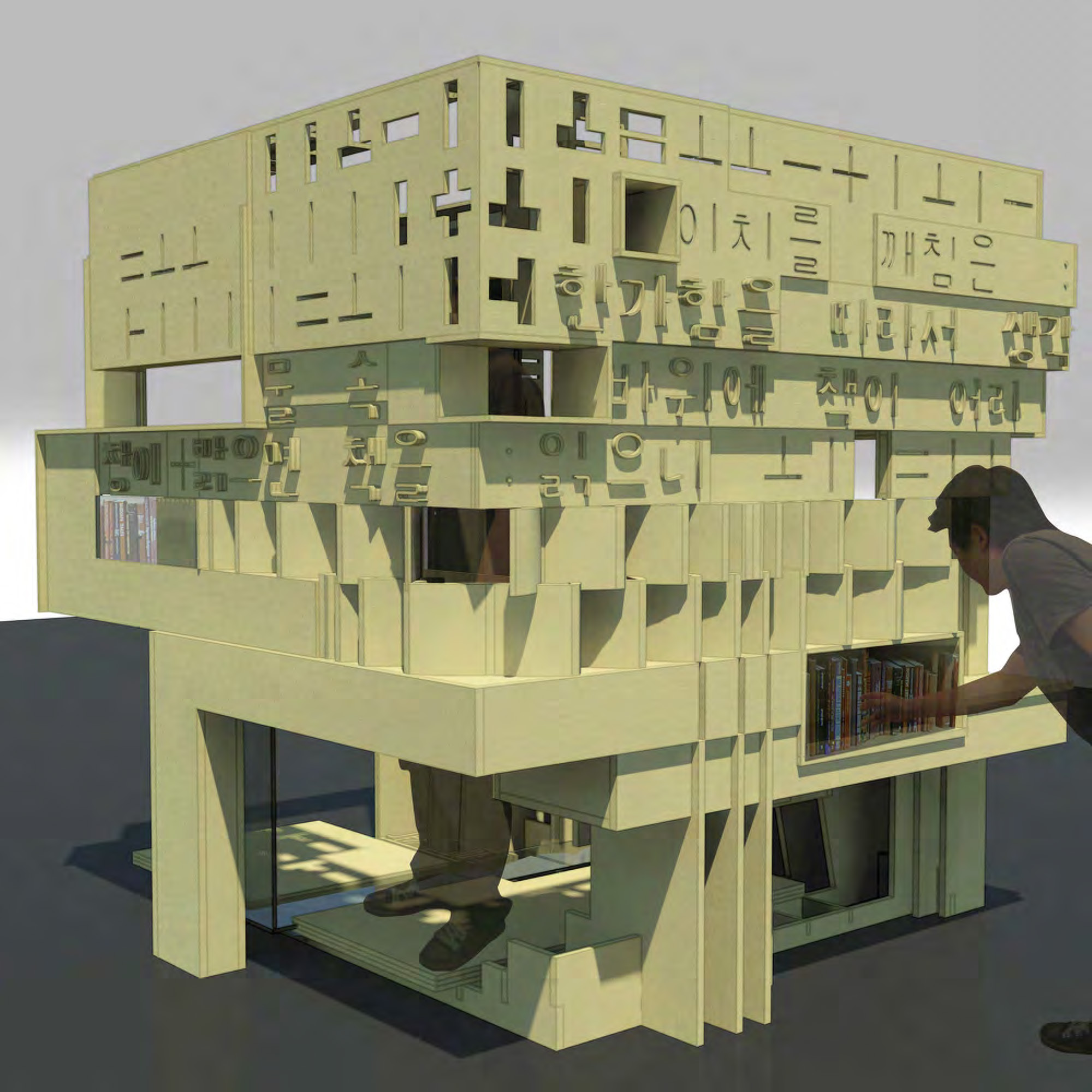 The gathering of hangeul and characters creates the sedimentation of our pavilion’s base. The glazing from the bookshelf extending down unto this layered sediment, covering the banned books now open below the surface.