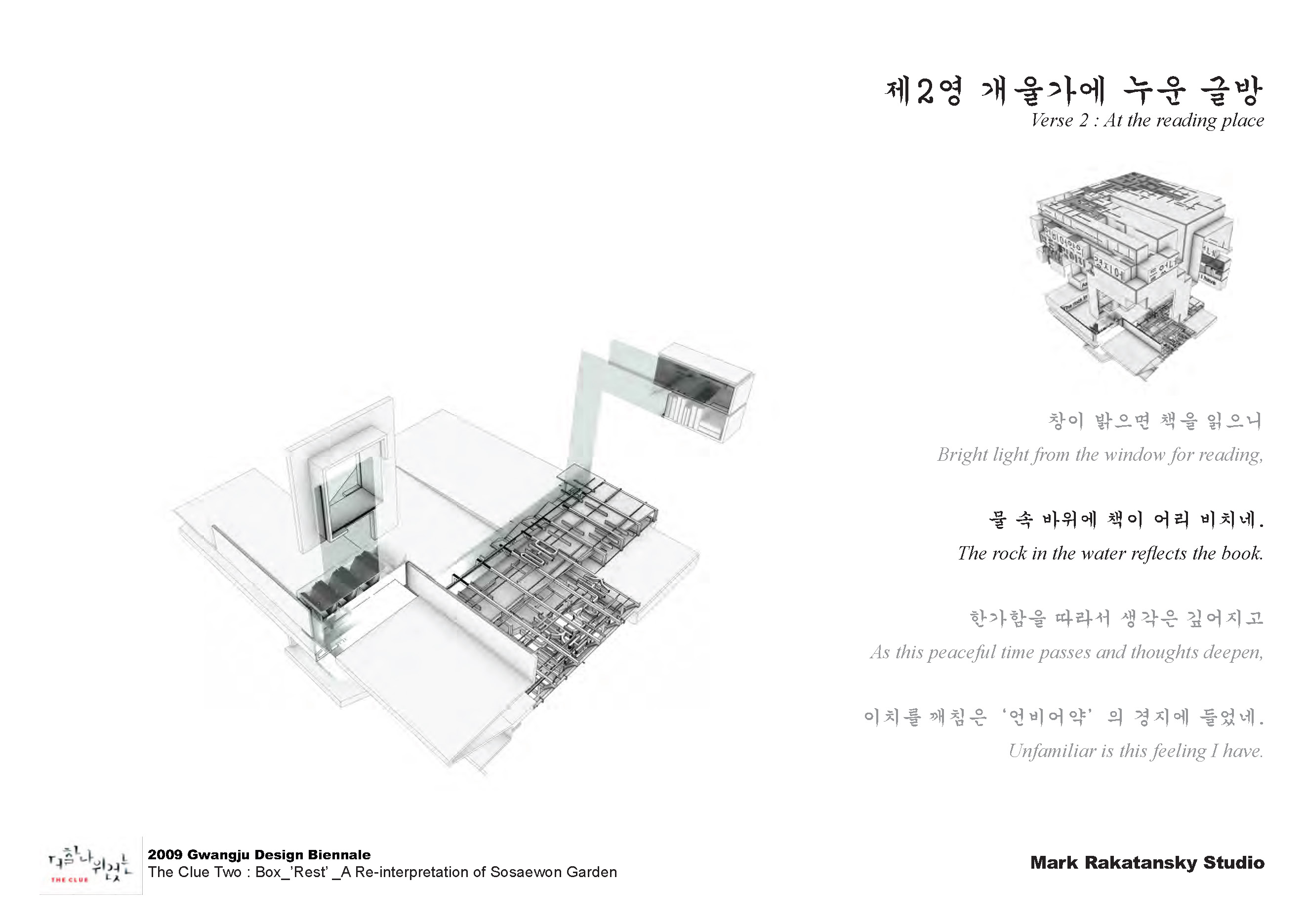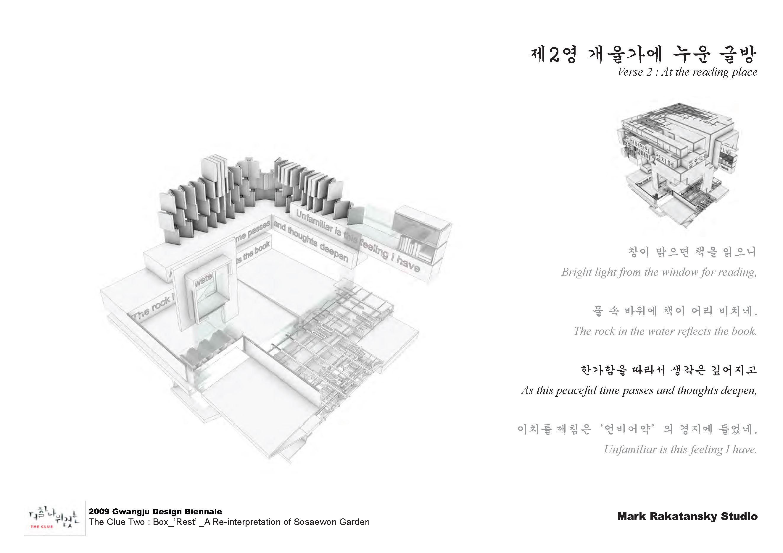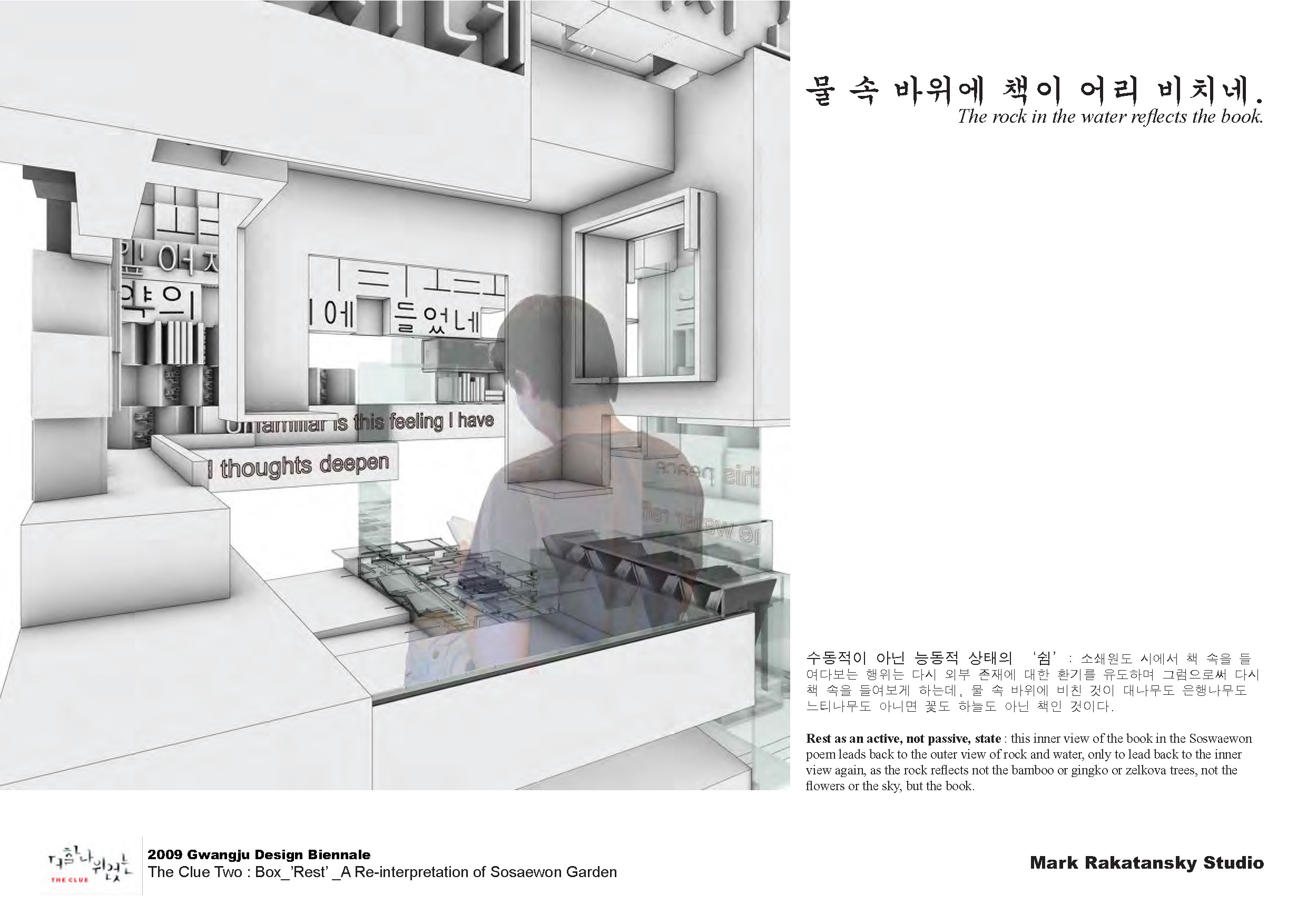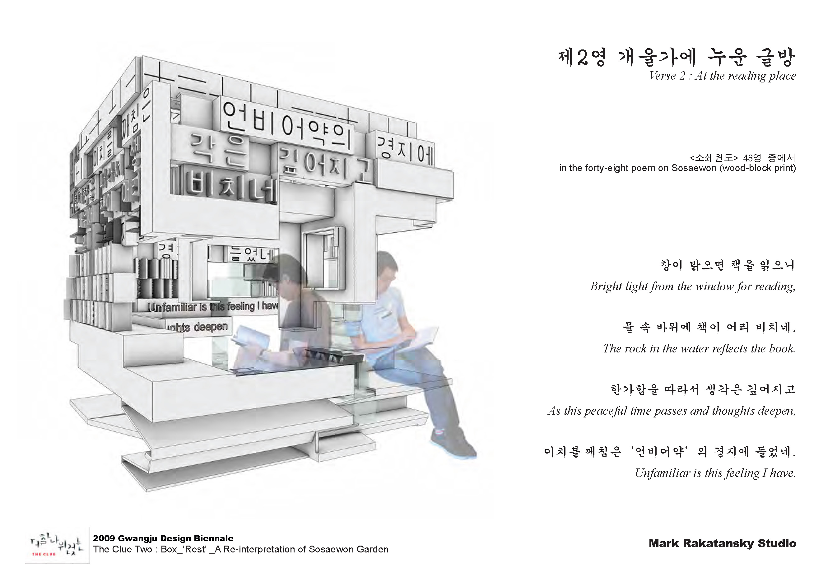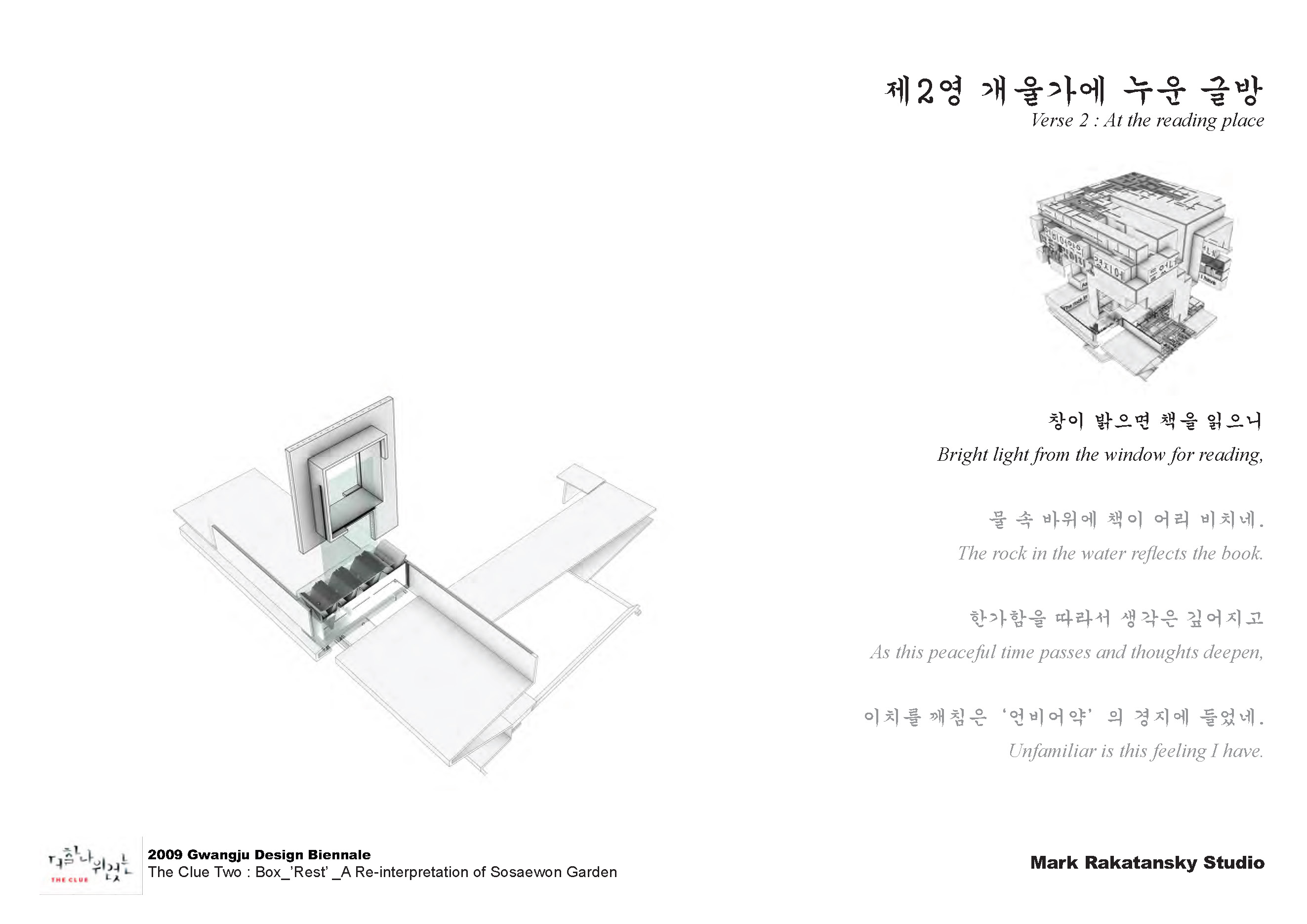 The Gwangju Design Biennale 2009 requested the design of a pavilion that reflected on the issue of rest in the traditional Soswaewon Garden, in relation to its representations in historical poetry and in drawing. The second verse of the Soswaewon poem chronicling the experience of the garden reads:
