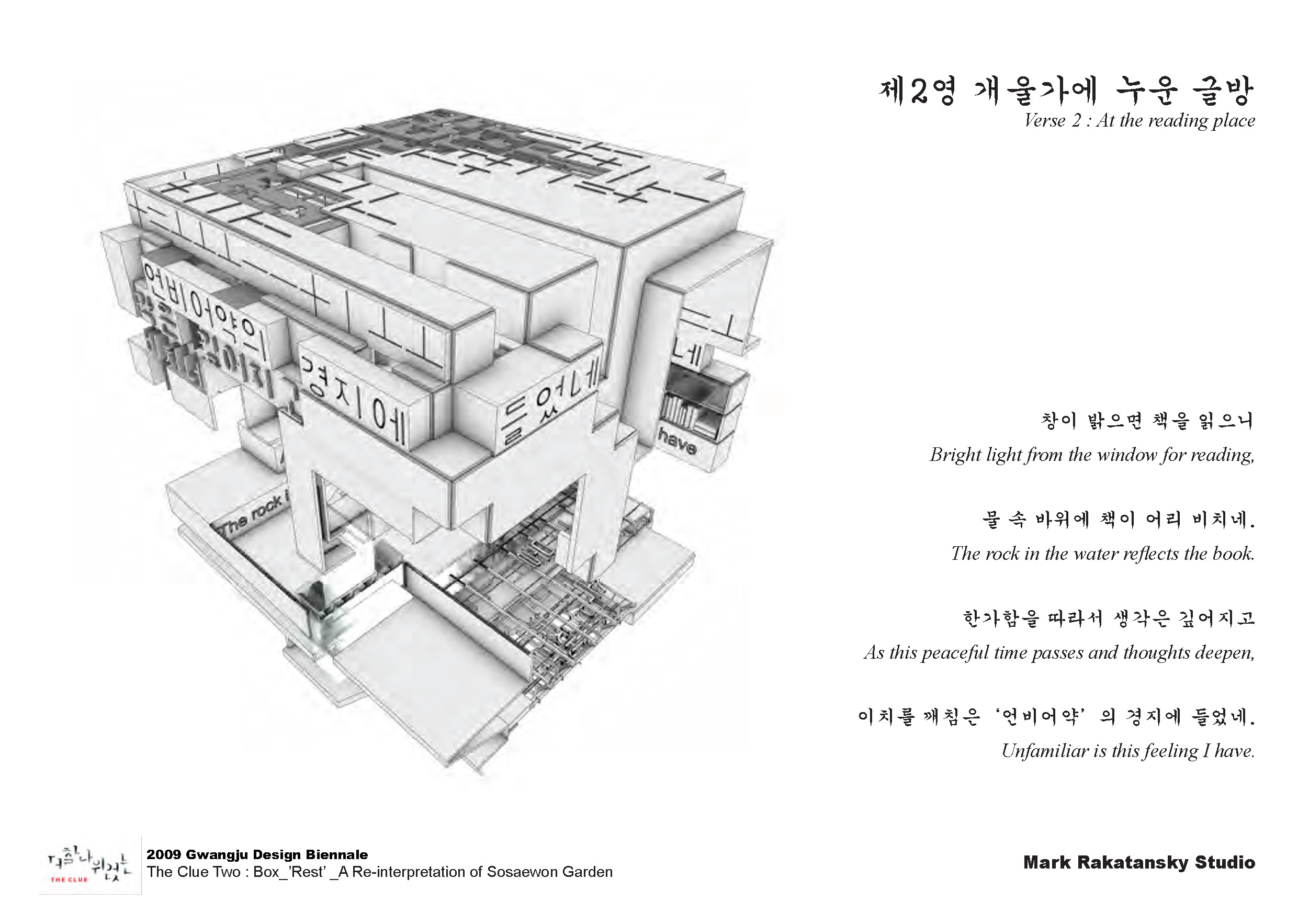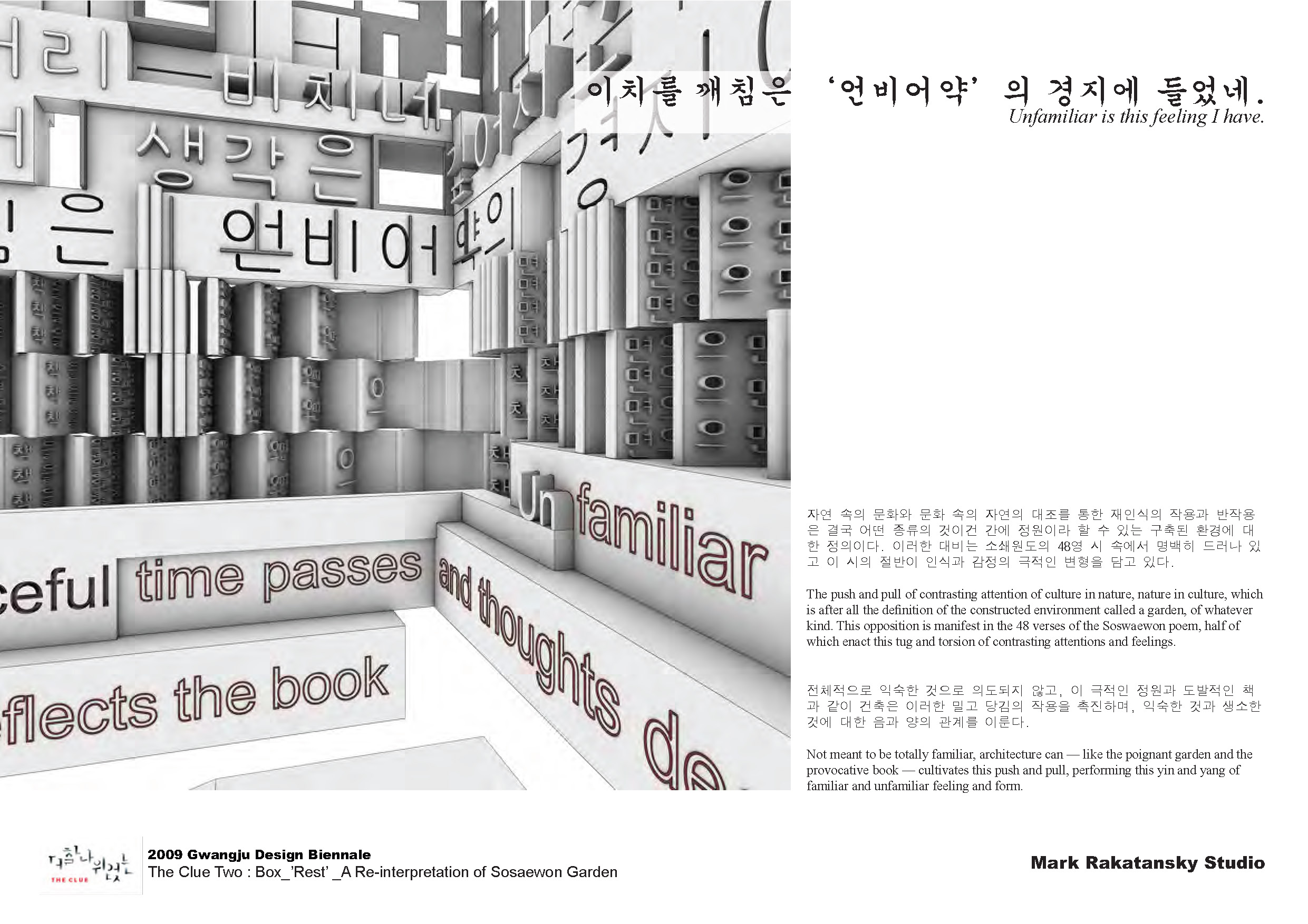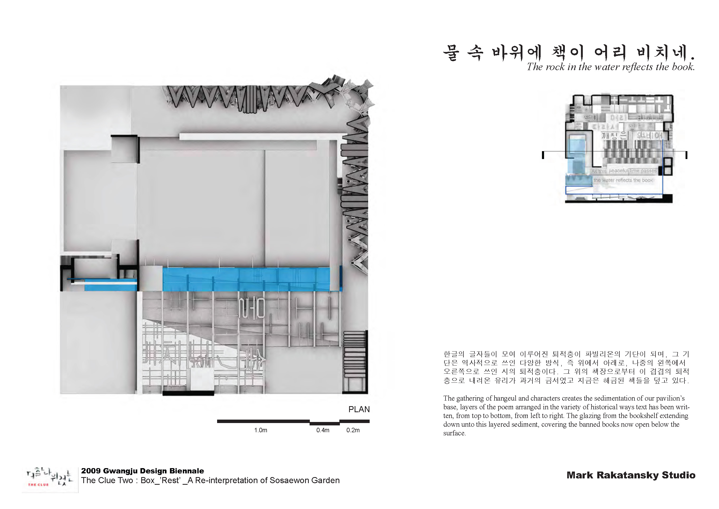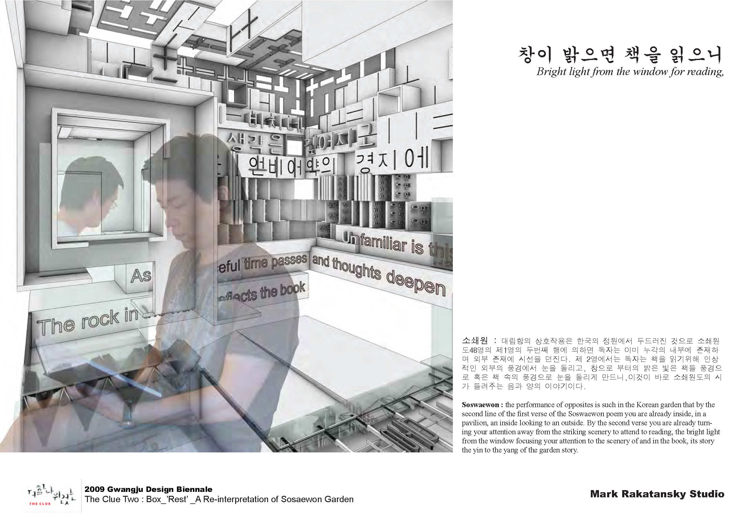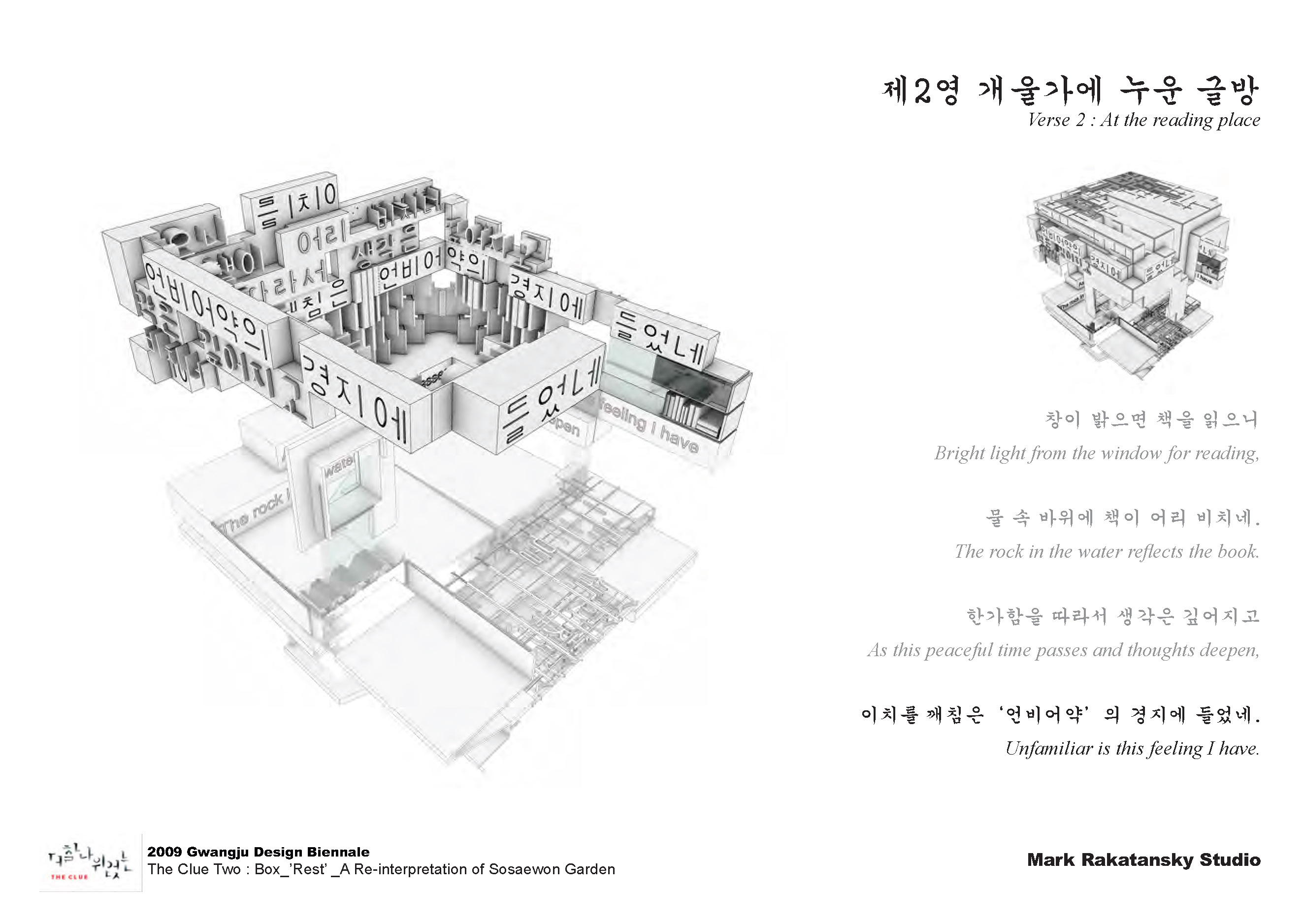 The Gwangju Design Biennale 2009 requested the design of a pavilion that reflected on the issue of rest in the traditional Soswaewon Garden, in relation to its representations in historical poetry and in drawing. The second verse of the Soswaewon poem chronicling the experience of the garden reads:
