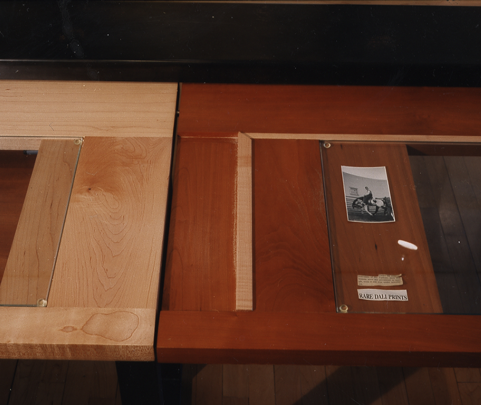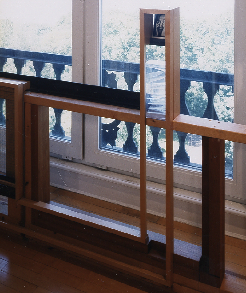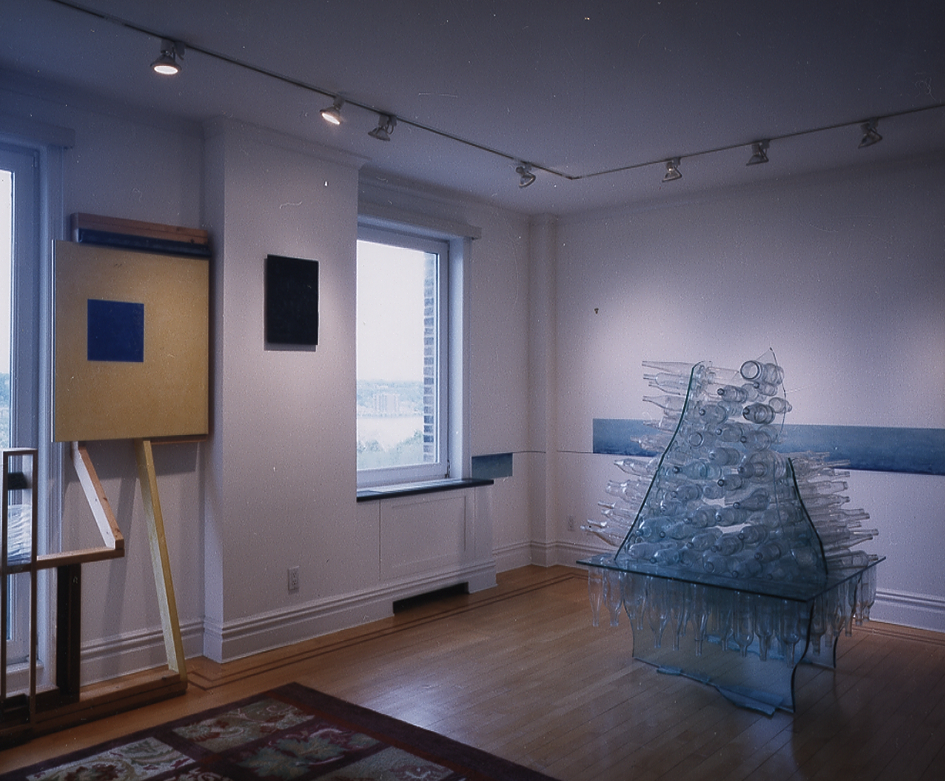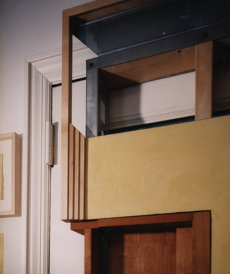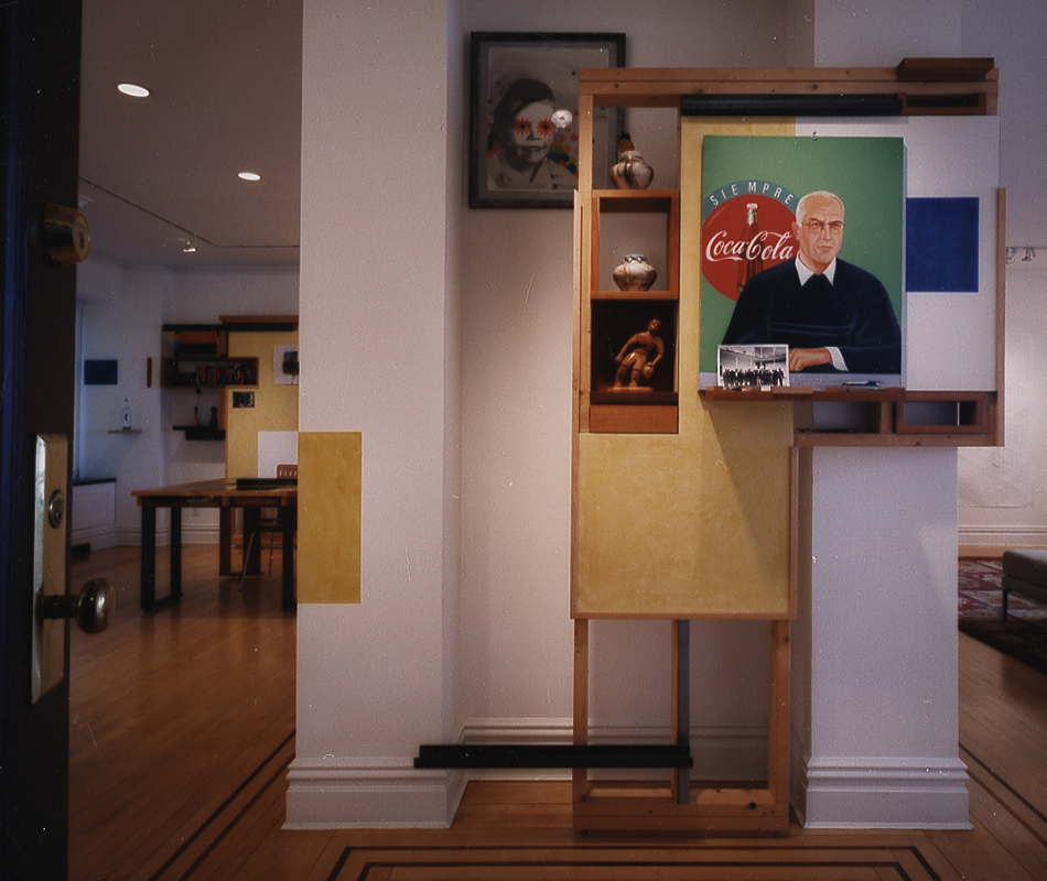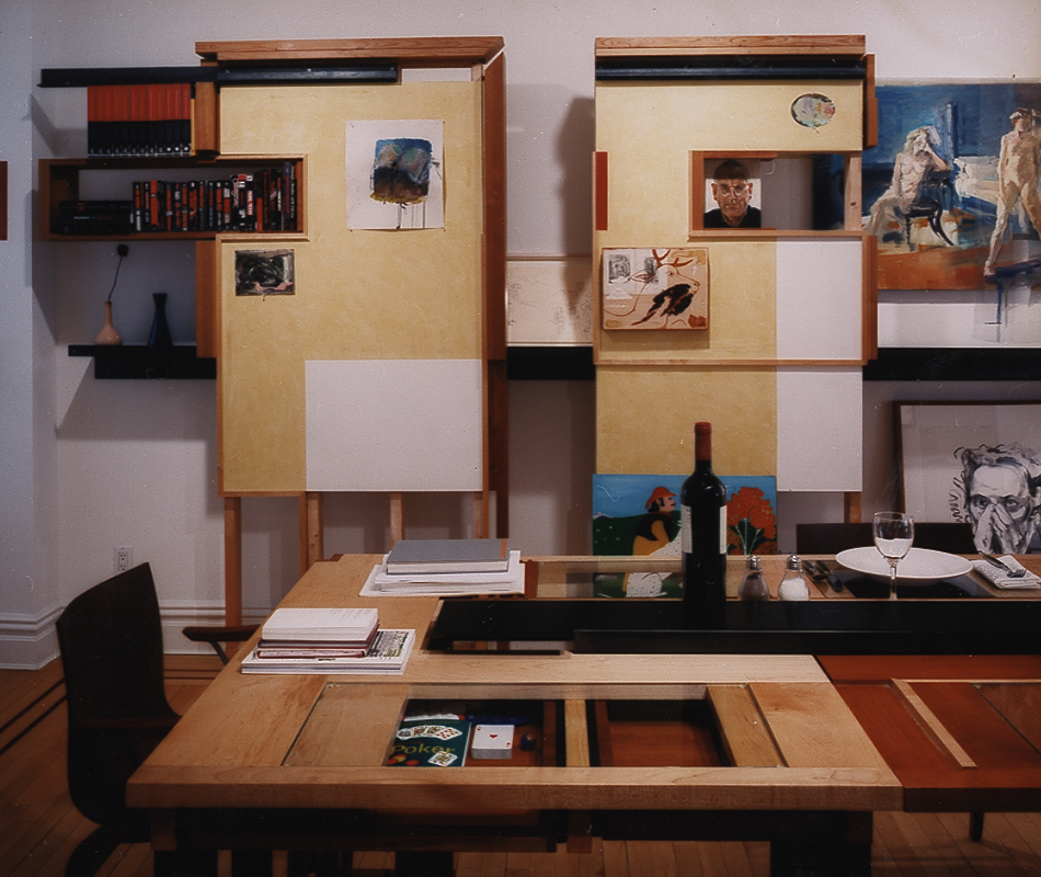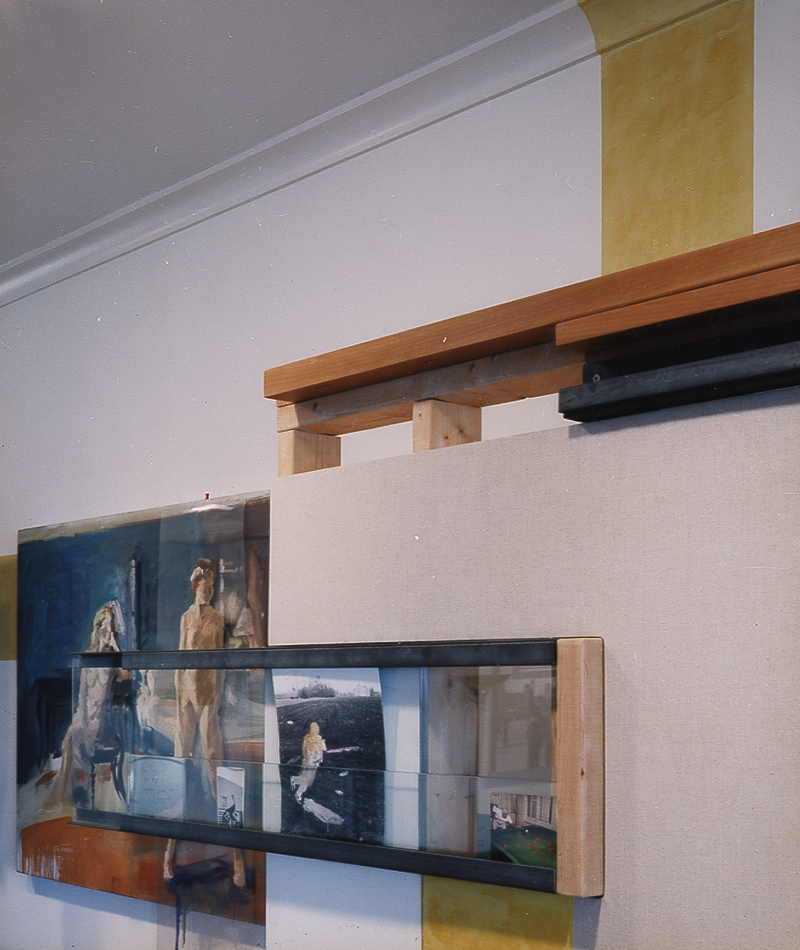 A series of display elements displaying the elements of display for the apartment of the Dean of the School of Arts. Through the repurposing of typical residential elements of display: frames (picture, door, and window), glass, dry wall, canvas, wood and metal studs and shelves, paint and pigment, a new system is grown out of and in dialogue with the existing architecture. These familiar elements change in character as they simultaneously function in the dual modes of gallery and residence.