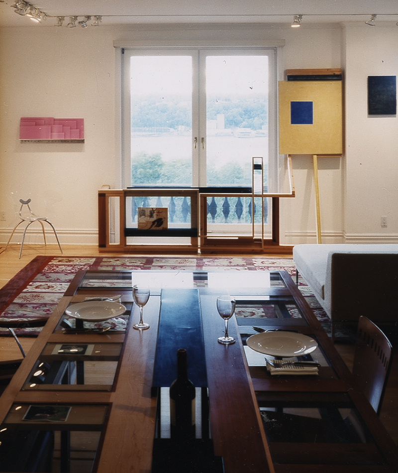 Here, as in many highrise apartments, the landscape exists as view: here of the Hudson River. The strategic use of color in this project draw forth the color from the views of the paintings of the collection and the views of the view. A mimetic version of some of the river-blues is brought into the apartment (as a double band to coincide with sitting and standing viewing) just as an abstract blue is projected out against the view. The view is thus perceived as part of the collection.
