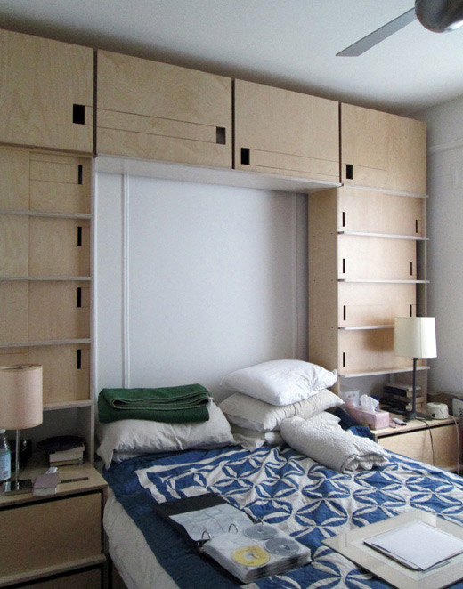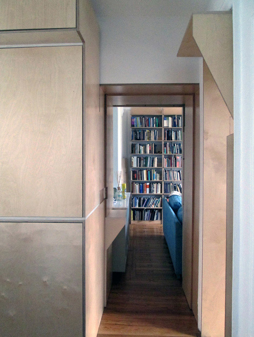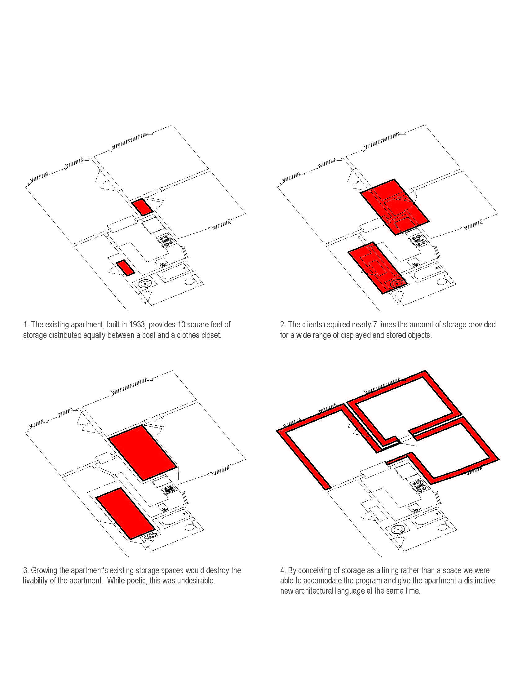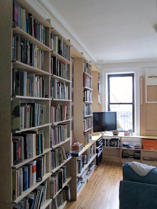 Is it space that holds our collections of objects, or is it our collection of objects that create a space for life? We are a part of our own collection. One of the best index of this situation is the escalating war between possessions and storage in New York apartments, particularly in the pre-pre-war buildings. The space of this 1920 apartment for a former rock star (now writer) and poet, once sufficient for a family of four is today inadequate for a couple of two. Since an apartment cannot grow out, we sought strategies to make it grow in.