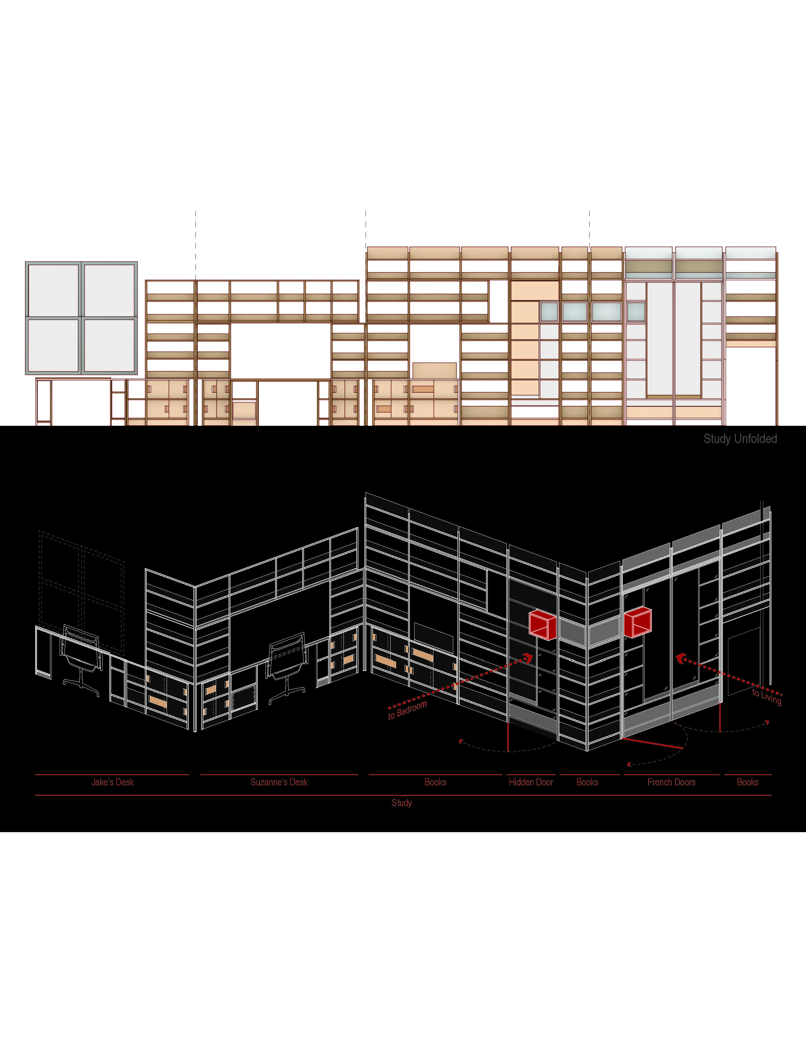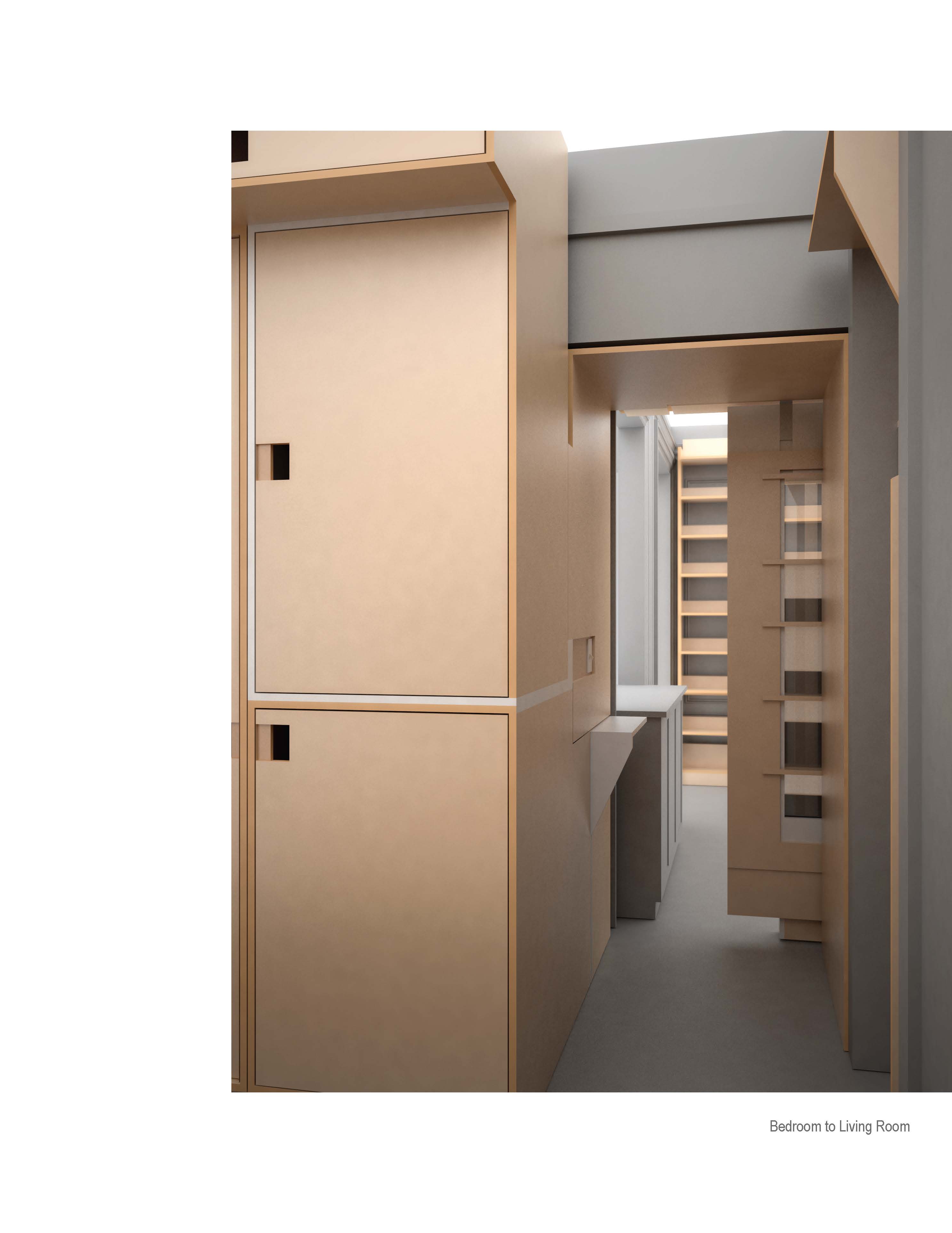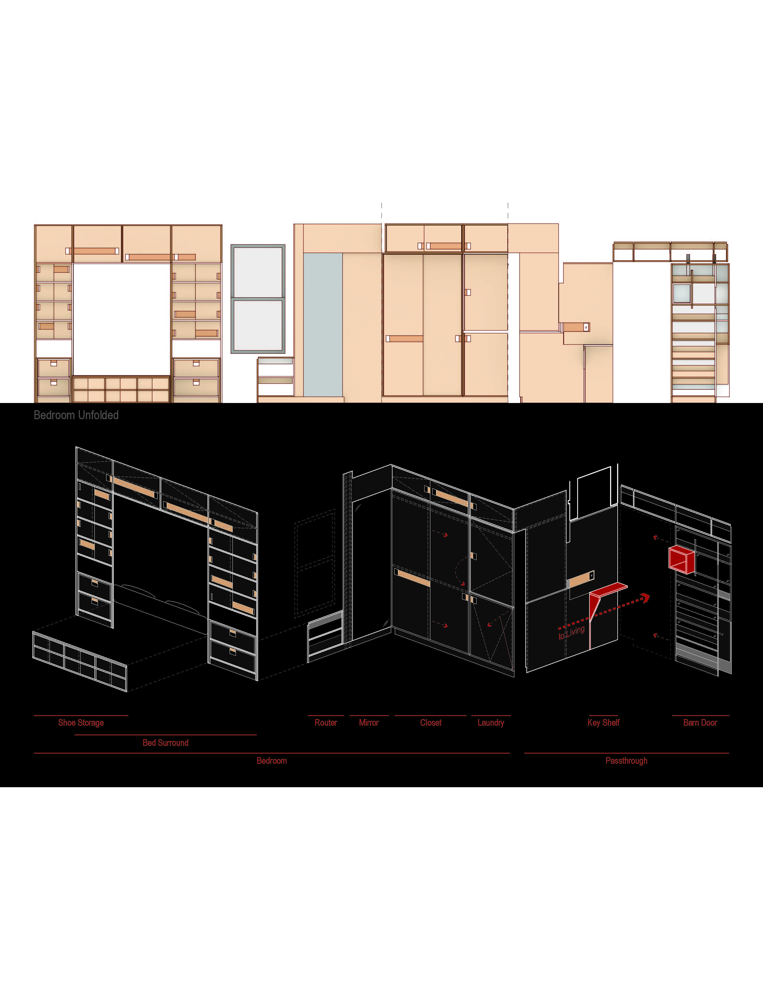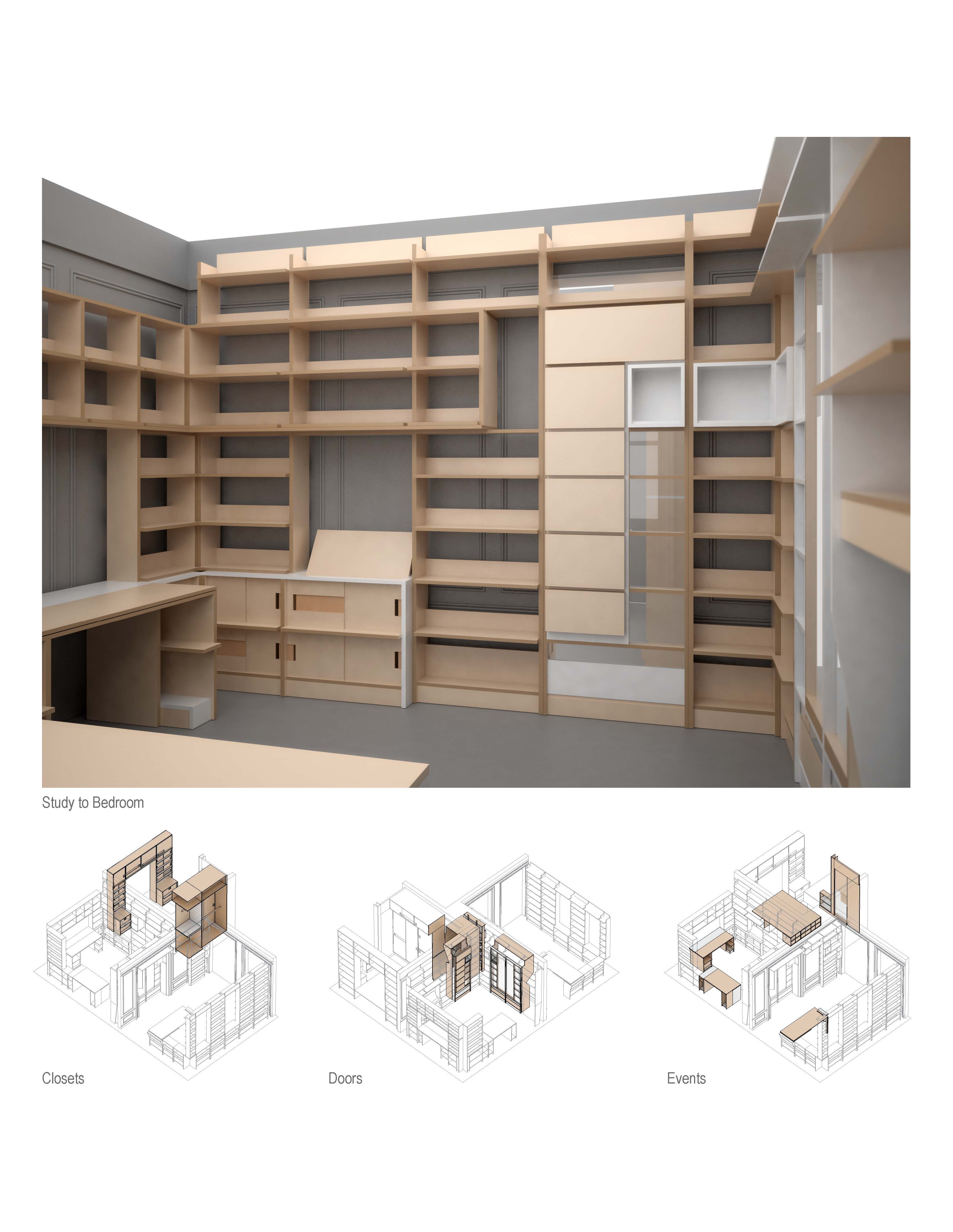 As such this project develops an inner-liner in which storage is no longer conceived as a reductive space within the apartment, but is instead the means by which spaces are defined. The liner unifies a range of passive modes (book storage, clothes closet, entertainment center) and active modes (dining table, desks, and movable walls) through the responsive and rhythmic interplay of its constitutive elements.