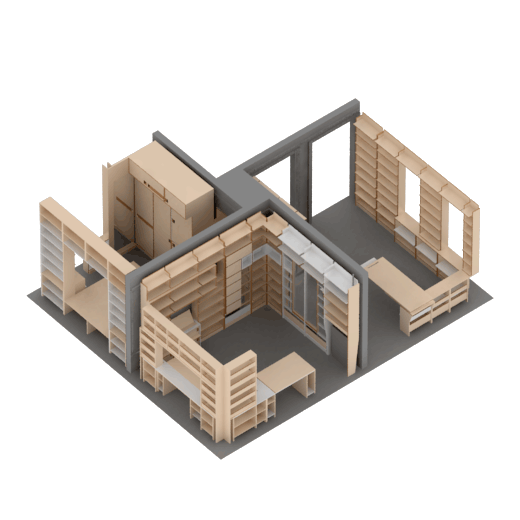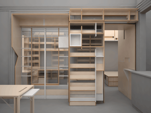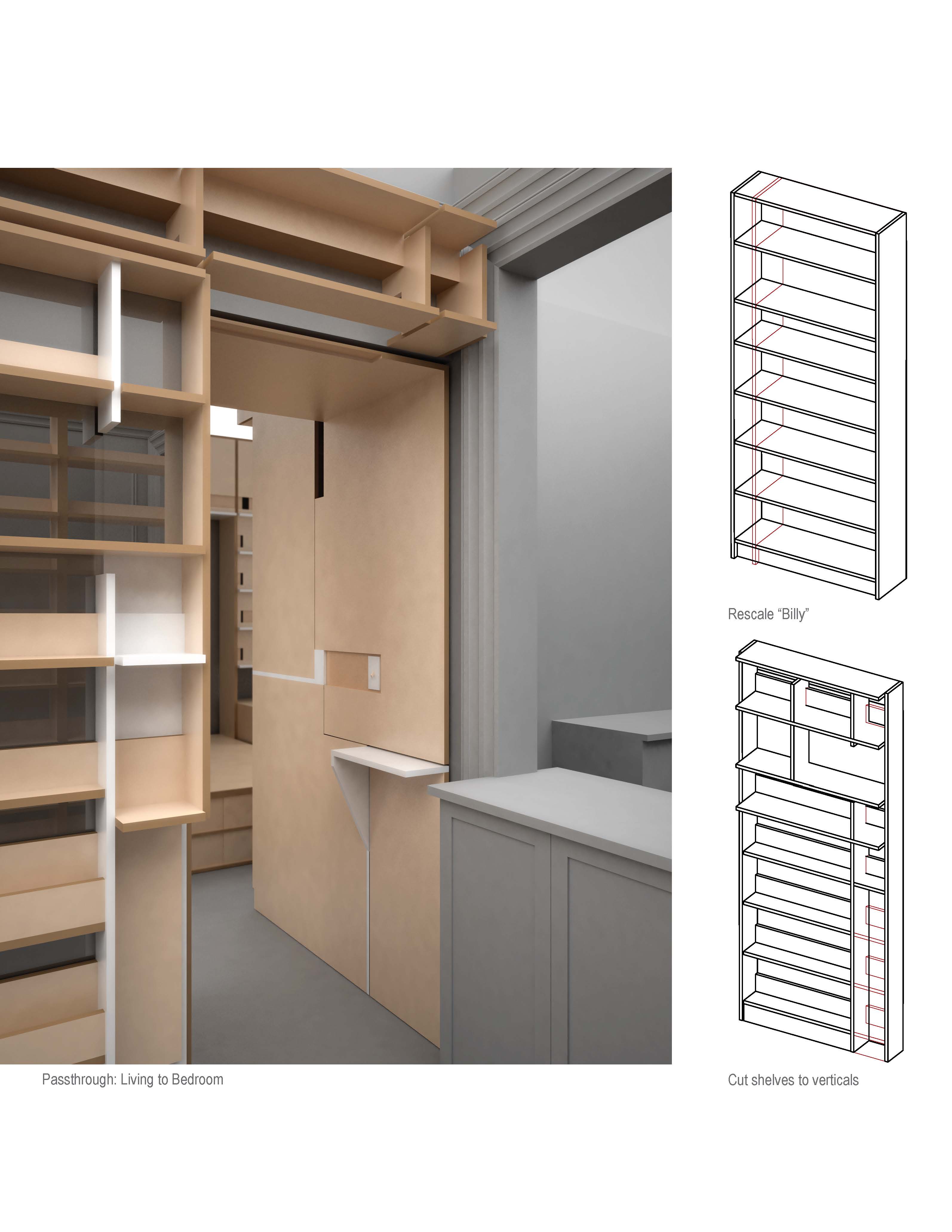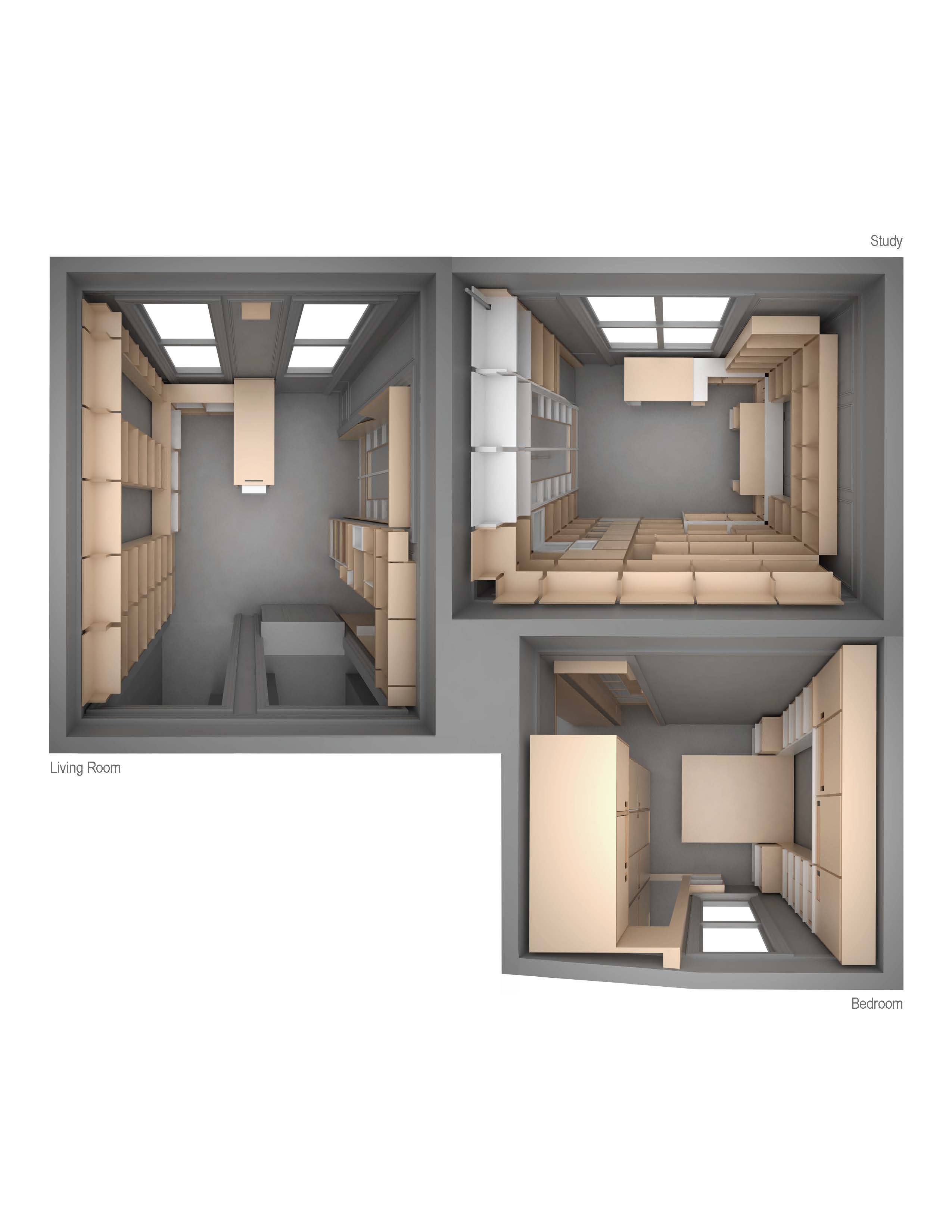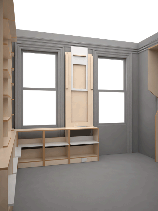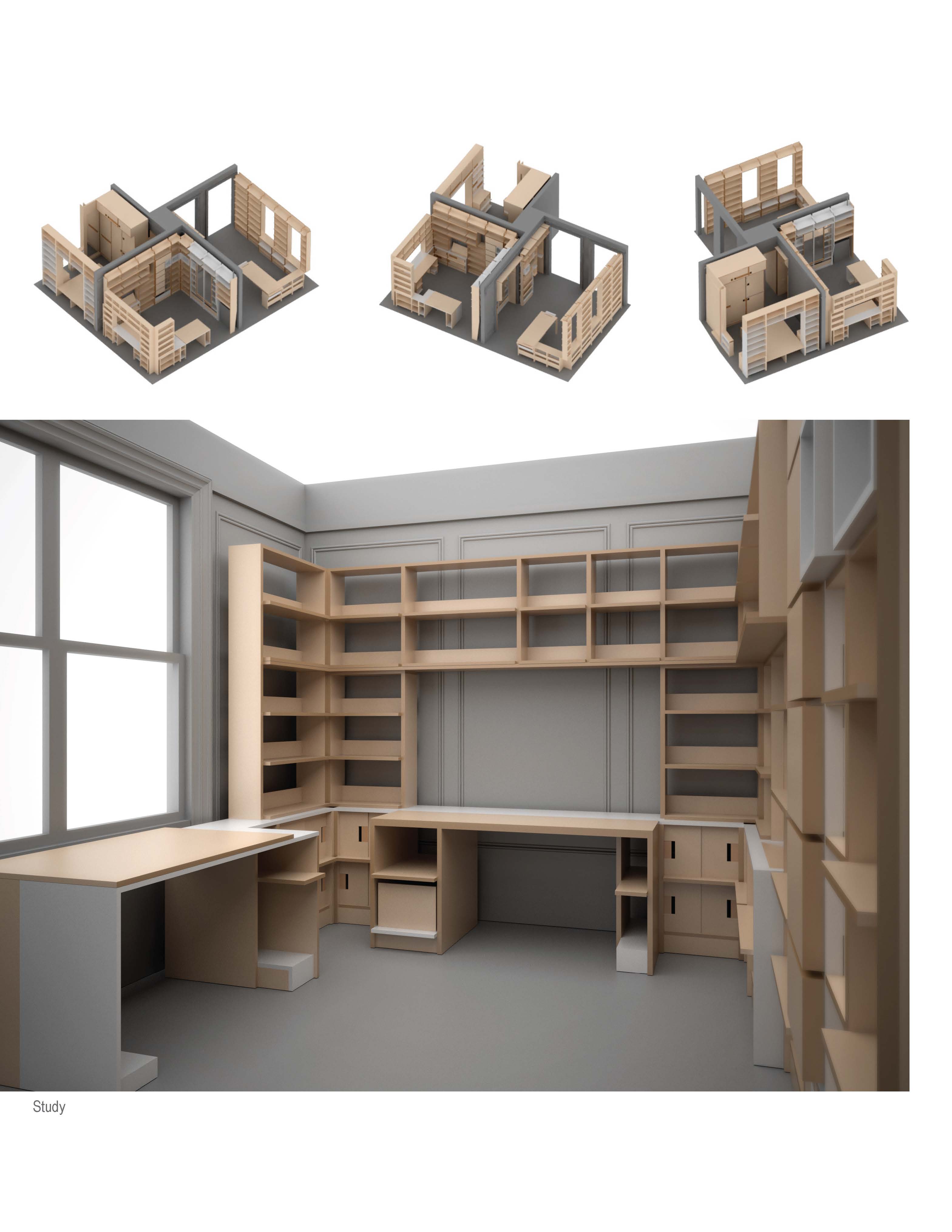 As such this project develops an inner-liner in which storage is no longer conceived as a reductive space within the apartment, but is instead the means by which spaces are defined. The liner unifies a range of passive modes (book storage, clothes closet, entertainment center) and active modes (dining table, desks, and movable walls) through the responsive and rhythmic interplay of its constitutive elements.