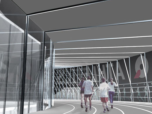 The new running track emerges out from and return into the existing gym, the track structure suspending out to establish a new entry, the trace of the track lines above providing the tracks for lighting to the entrance below. The live runners will be accompanied by time–motion images of a running runner, screened onto the glazing, from the first motion study of running by pioneering scientist Etienne-Jules Marey. This static and dynamic motion will be visible in relation to the dynamic motion of people on the stationary exercise equipment in the new fitness center situated under the running track.