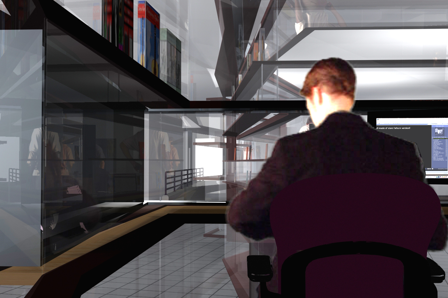 The multi-media activities of the Music Library are brought up to and into and out from the wall.
