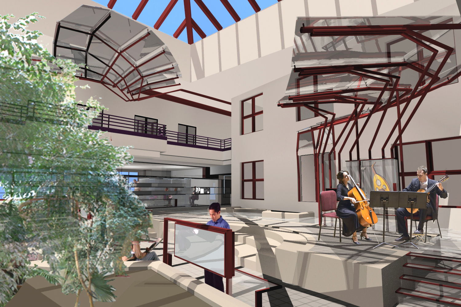Along with the addition of band-shell and balcony canopies to provide visual and audio focus for afternoon and evening performances, the School of Music atrium is revitalized through the development of an interactive interface to the Music Library. The multi-media activities of the Library are brought up to and into and out from the wall: the circulation desk, the recent media acquisitions (books, CDs, DVDs), the School’s Baroque instrument collection, and research stations for digital listening.