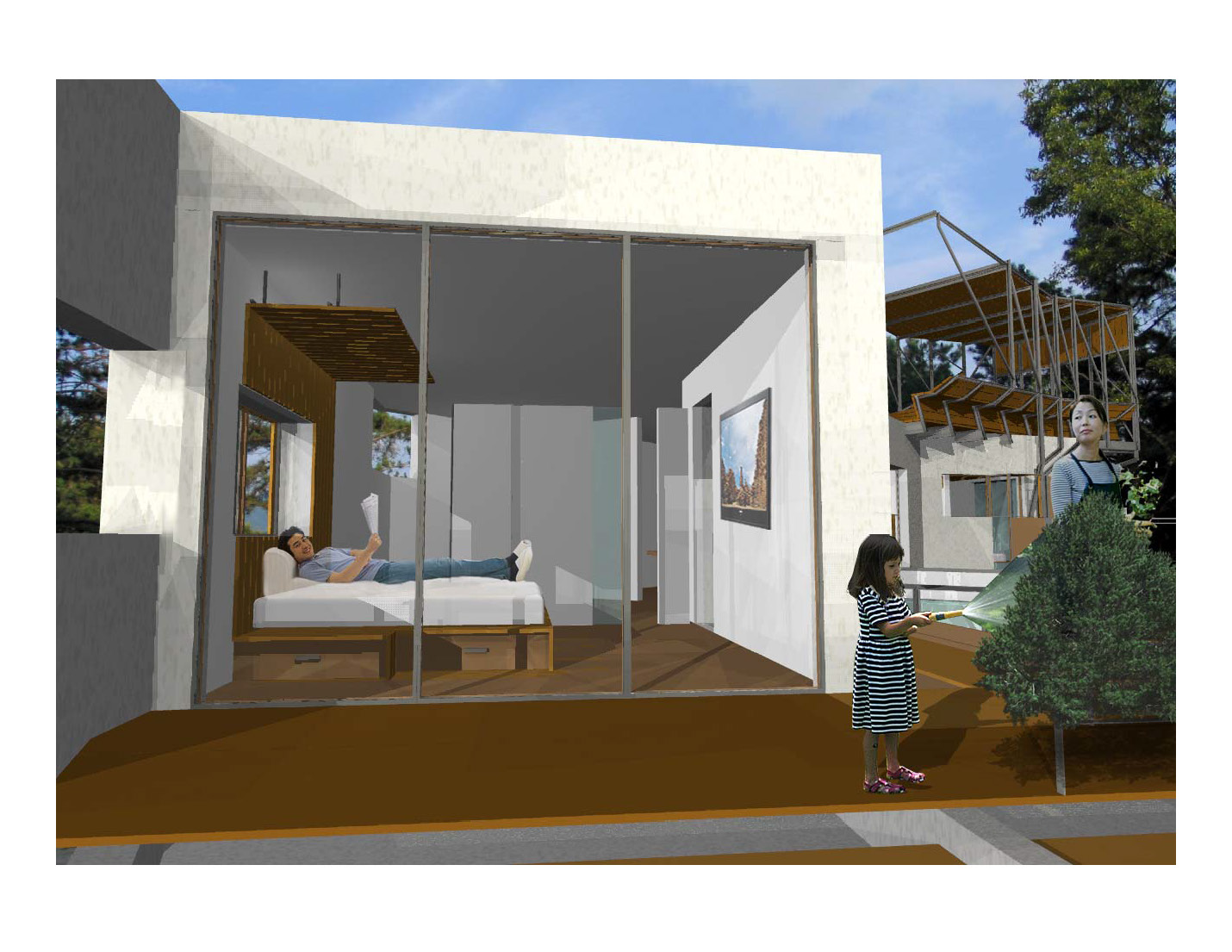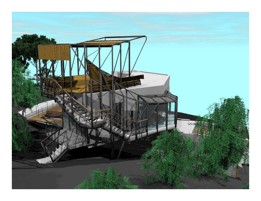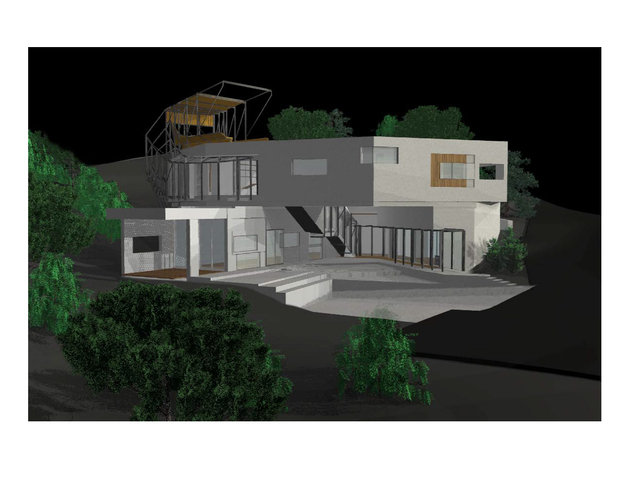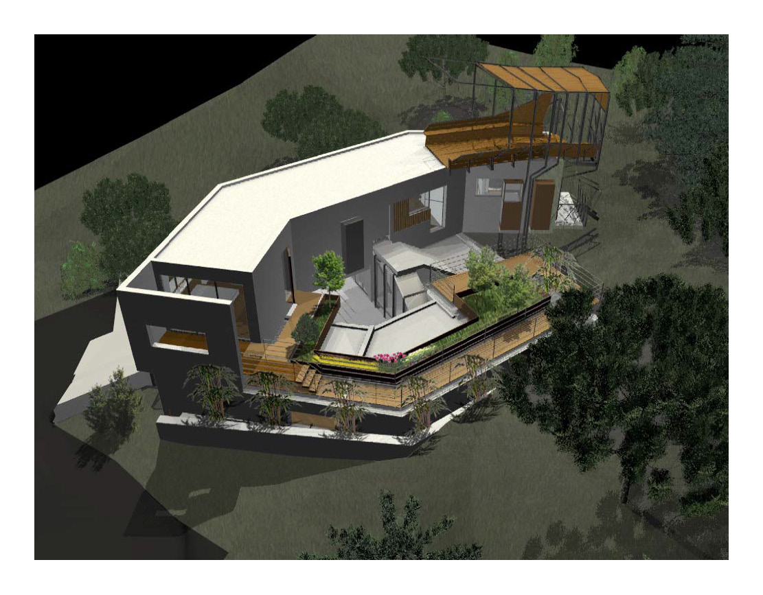 When the circulation spine reaches the end of its passage up to the roof it into expands again to become the covered roof terrace, as it turns back around toward the auspicious southeast view toward the landmark hills in the distance, and to the view of the house itself and the second level gardens below. For the lone viewer or the gathering of family, this is an active viewing in an active place of rest.