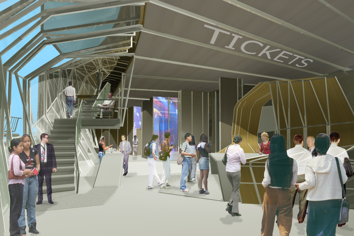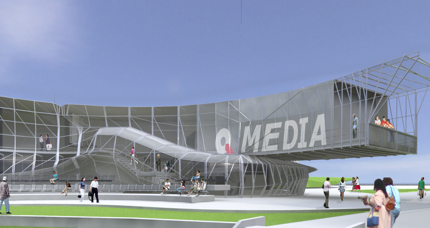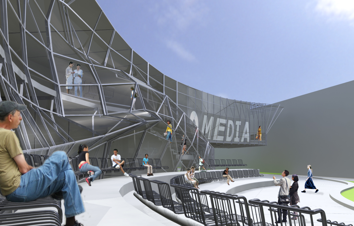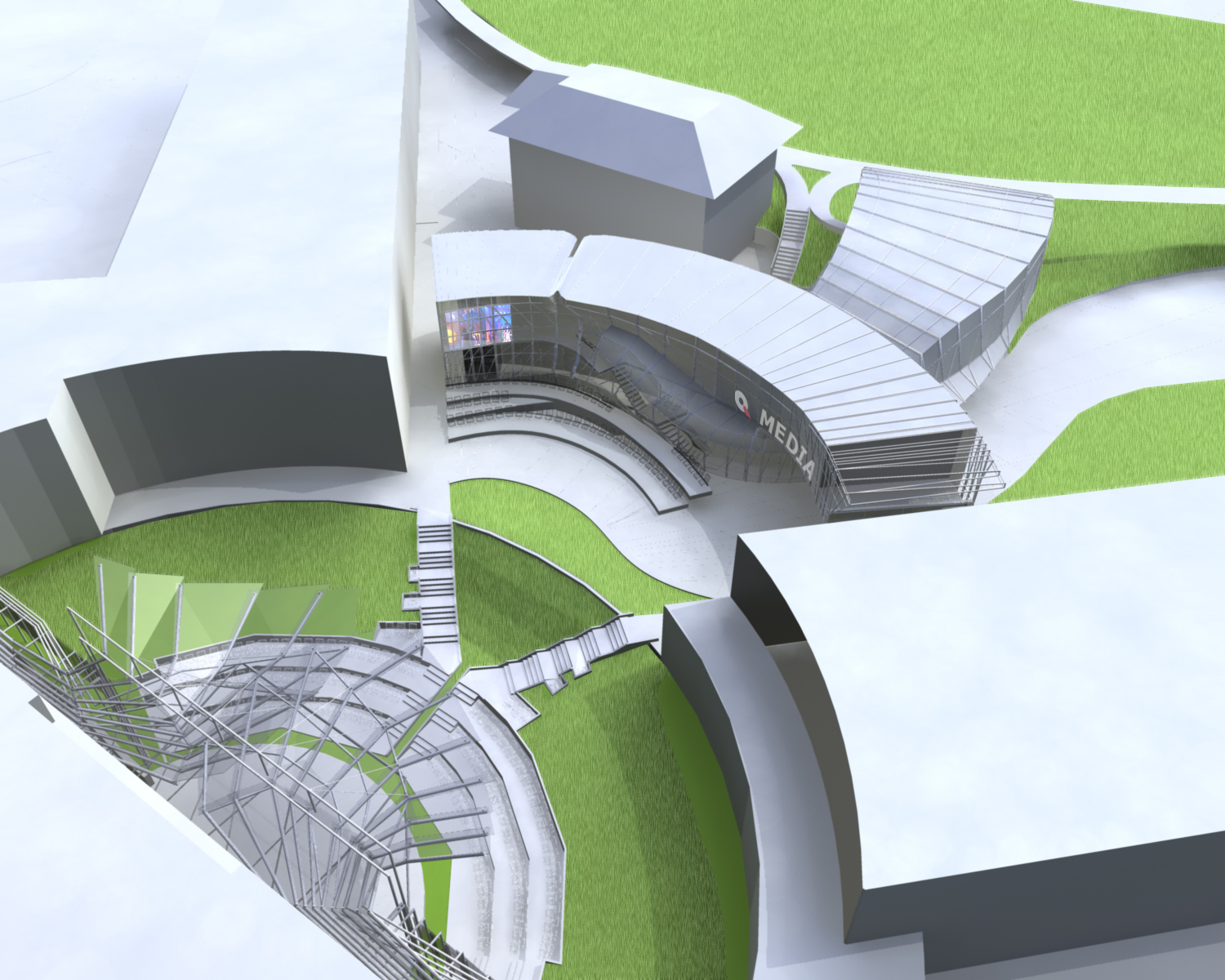 The Media Arts Center enacts a dynamic positioning, addressing the radial arrangement of the existing arts complex and the Open Theater at the upper level while simultaneously inflecting the lower level auditorium out towards the neighboring building that houses the media faculty offices. This opening out draws together the public open space of the upper Campus Plaza and the lower Open Theatre. While the outdoor seating of the Open Theater inflects inward to the lobby, the stair in turn inflects outward as it rises up to the Media Production Studios on the second floor, situating exchanges between individuals and uses, inside and out — the middle terrace incorporating into the lobby space, first as a refreshment counter and then extending as the stairs.