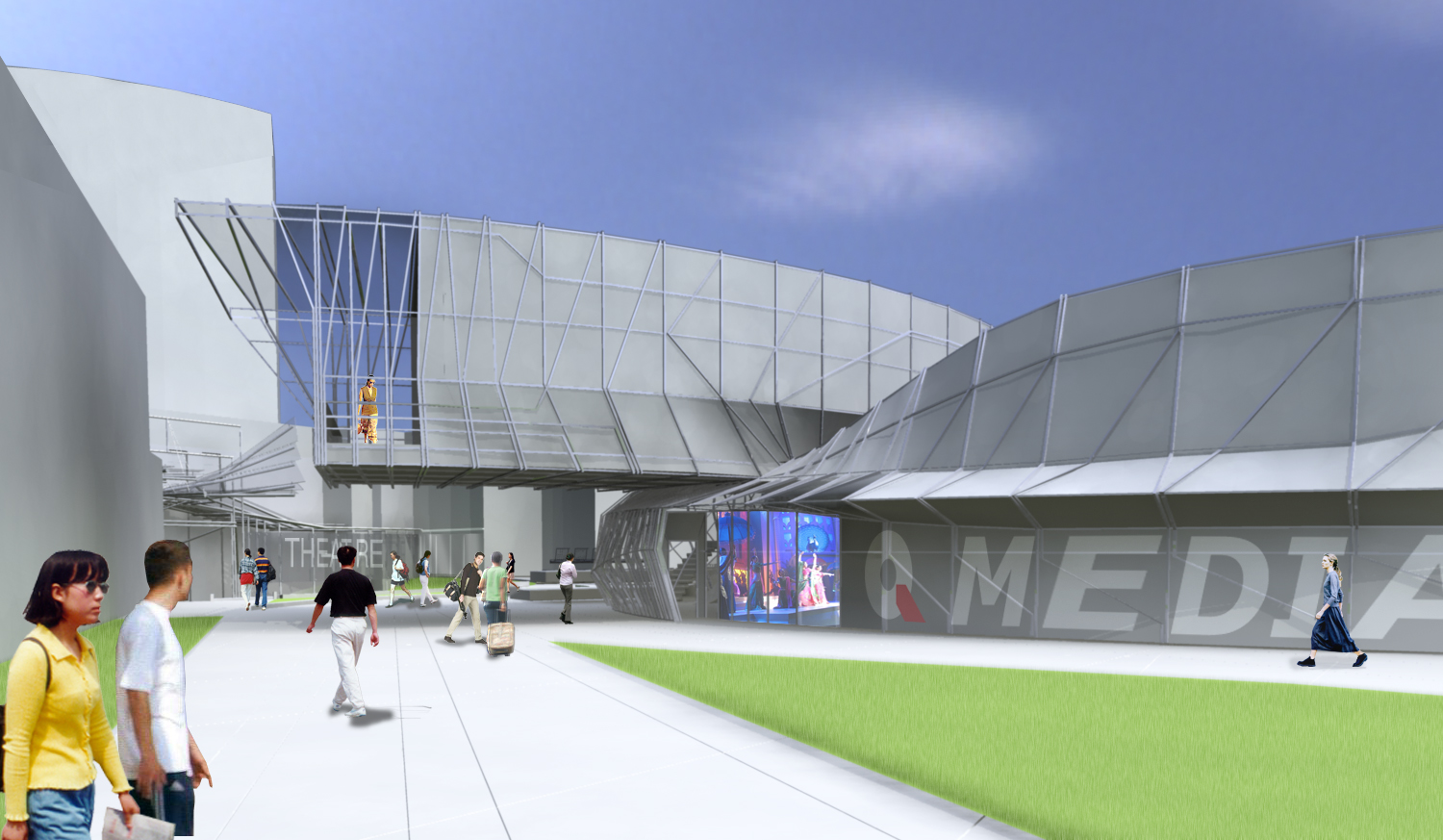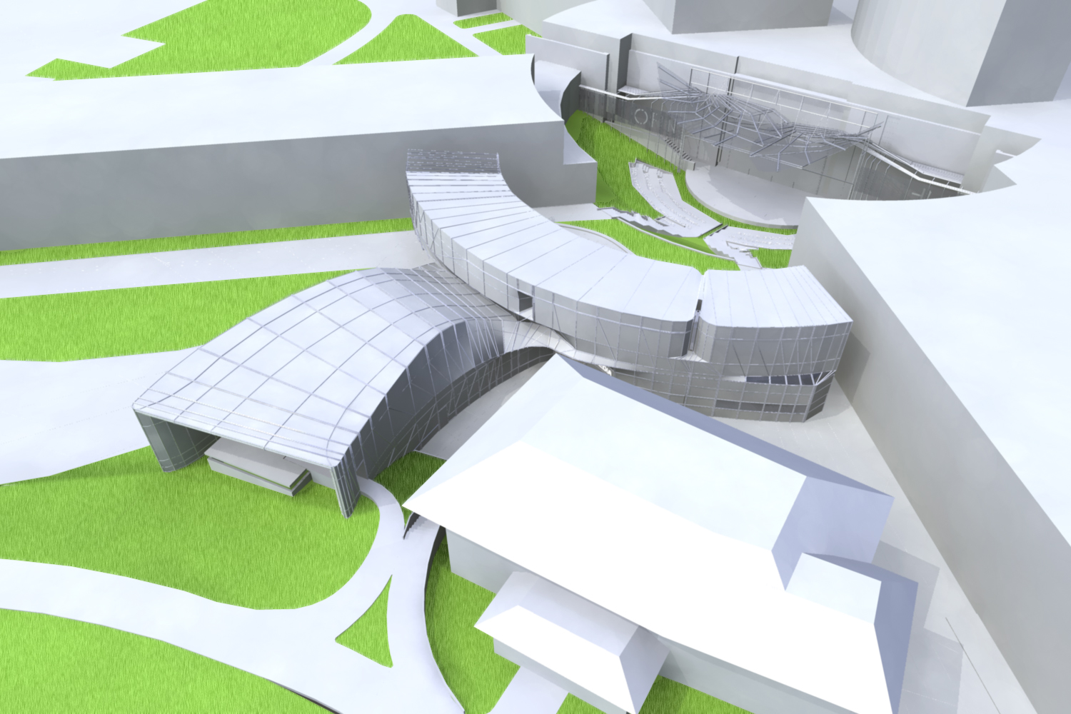 Simultaneously inflecting toward the Open Theater to complete the radial arrangement of the existing arts complex and toward the Central campus alongside the building that houses the faculty offices.